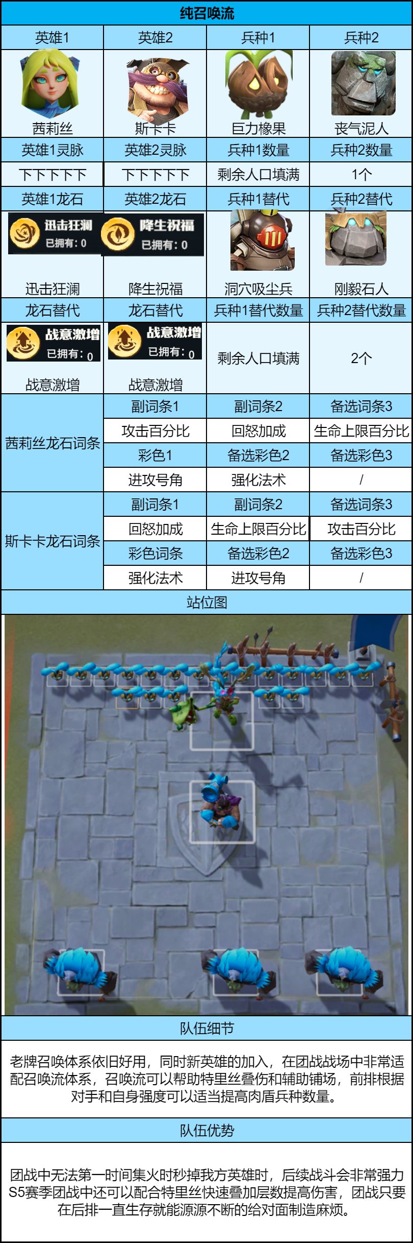 队伍建议保证有一定单军强度,低养成情况下,尽量选择第1队有单军战斗能力的队伍,后4队可以选择偏重团战队伍。