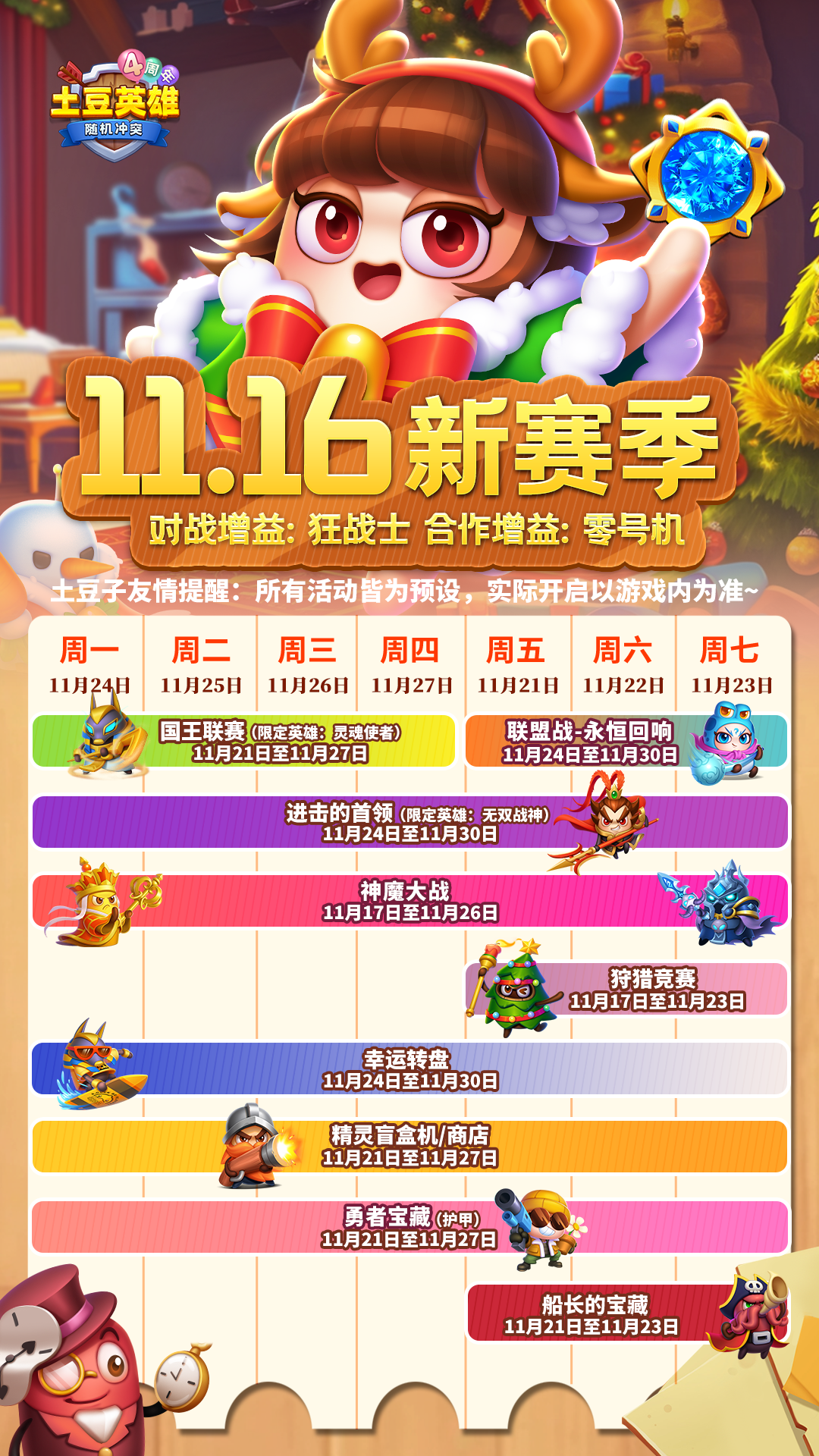 11月下旬赛季的对战增益英雄为:狂战士,合作增益英雄为:零号机