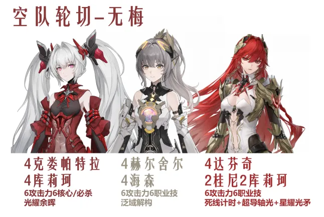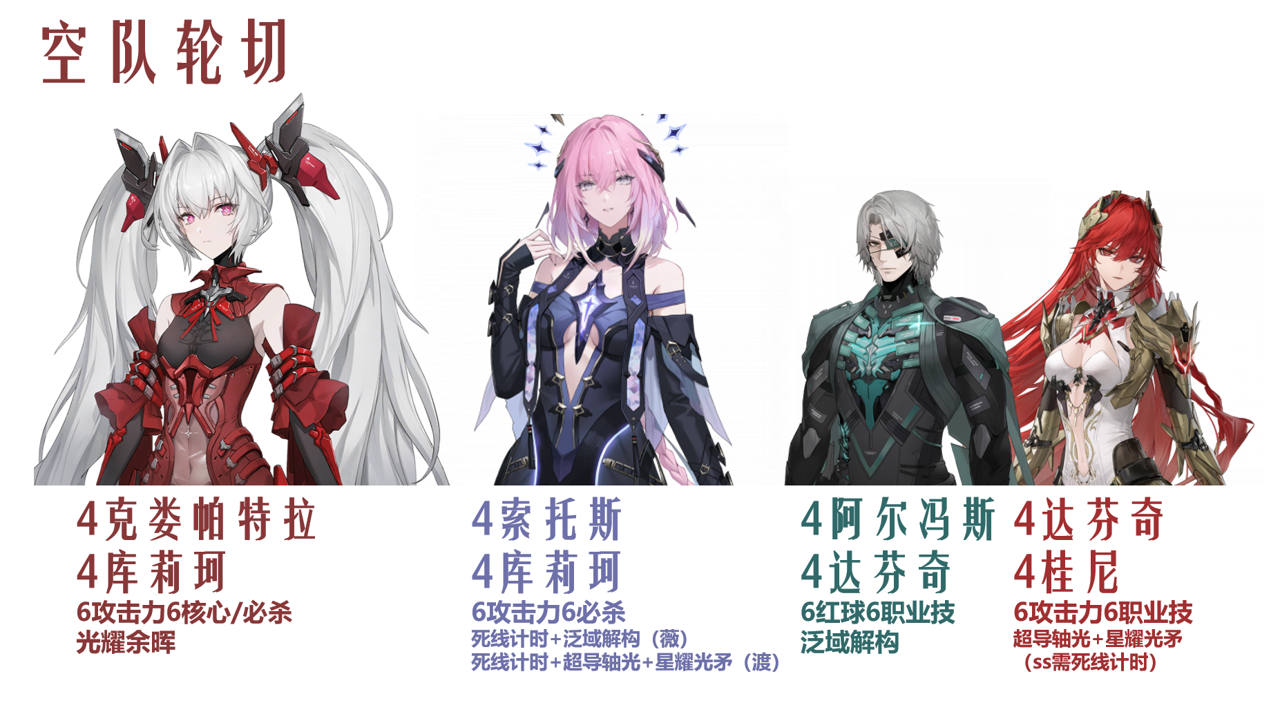 空队双c的输出流程基本固定,只需要根据第三人情况选择不同的切人顺序即可。站位要求不高,别把幻日放蓝即可。队长技选择终焉。