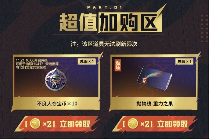 不良人夺宝活动将于11月21日正式上线,同步更新的11月宝库还支持兑换10连抽机会,届时大家可以使用2枚高级十火币在超值加购区兑换10枚不良人夺宝币,助力抽取HK417-天暗星等不良人联动武器。同时本次活动一元购活动将同期开启,每人可直接购买10次且无每日限制,首次十连更享9折优惠,以超低门槛解锁海量联动好物。