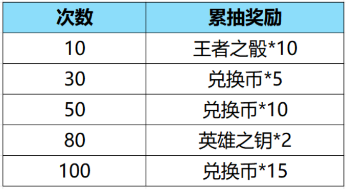 活动还设置累抽奖励:累计10抽送王者之骰10,30抽送不良人兑换币5,50抽送不良人兑换币10,80抽送英雄之钥2,100抽送不良人兑换币15。