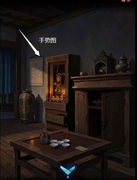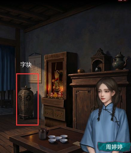 7、将茶叶放进碗中,倒水,可看见碗底有不同的图案,顺序,以及茶叶代表的左右,茶叶在左即为左边柜子,茶叶在右即为右边柜子,根据这个信息点击神龛下方的柜子,获得瓷瓶。