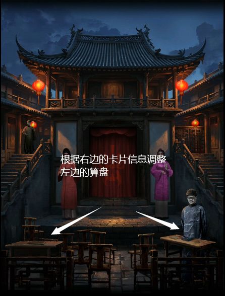 1、根据右边蓝色纸人手边的卡片正面“个万十千百”和背面“一五四六九”,点击左边桌上的算盘,获得纸元宝。