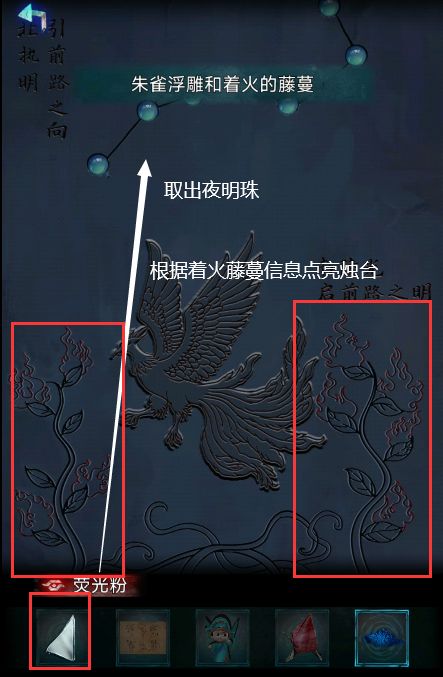 13、镜子碎片取出墙上的夜明珠,根据墙面绘制的藤蔓着火细节,使用火折子和夜明珠分别对两个灯架进行点火,石门打开。