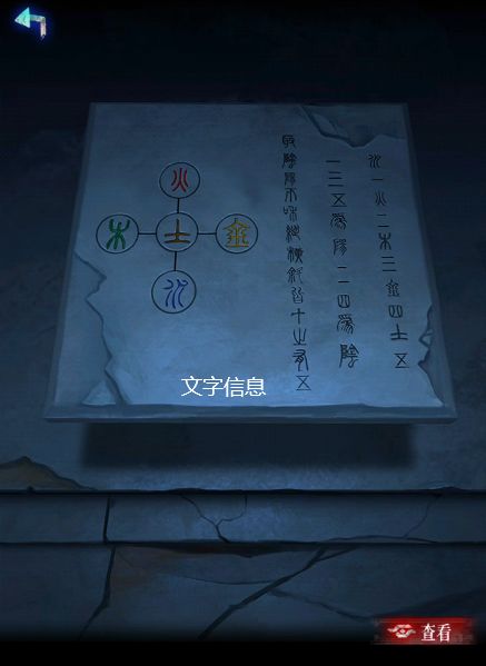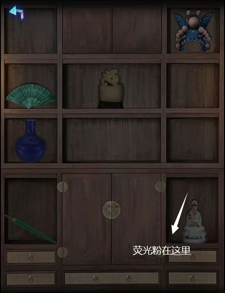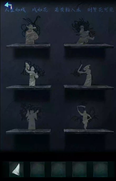 12、桌面有文字描述不同物品的放置信息,根据这个信息调整柜子上的物品获得荧光粉,荧光粉撒入水池,获得植物和文字信息,纸桃给戏台右边的纸人,根据之前的图调整手势,获得碧色石头1.