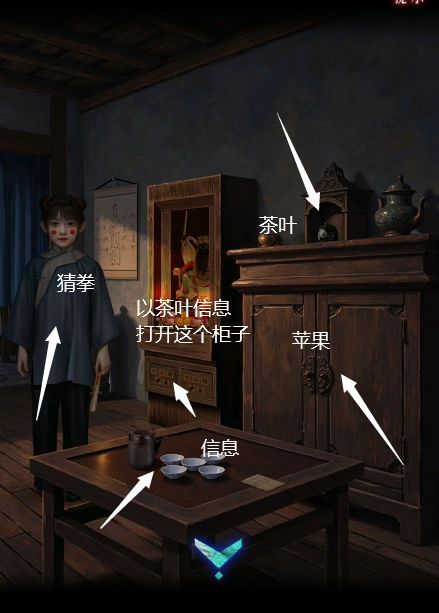 5、戏票给左边二楼的纸人,可进入二楼房间,桌上有茶杯茶壶,旁边有纸条提示需要从架子上拿到茶叶,和左边的小女孩玩猜拳,获得折扇(注意看游戏提示,听声音辨别对方出什么)。