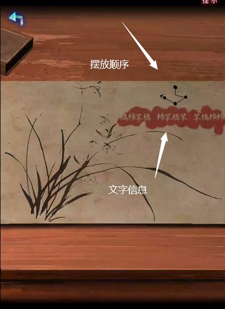 4、铜钥匙可打开书柜下方的锁,看见干了的红颜料,用之前获得的毛笔蘸书桌上的水,再蘸红颜料,使用有红颜料的笔在书桌上的字画上画,看见橘柿苹橘 柿苹橘苹 苹橘柿柿的信息,且上方有摆放顺序。