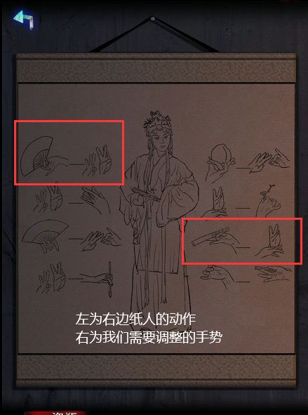 9、把扇子给戏台右边的纸人,即可调整左边纸人的手势,根据二楼房间的手势示意图调整,获得纸桃花。