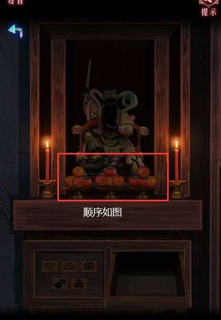 8、把苹果放在神龛上,根据之前获得的信息橘柿苹橘 柿苹橘苹 苹橘柿柿,还有摆放顺序调整水果位置获得字块“吾”。