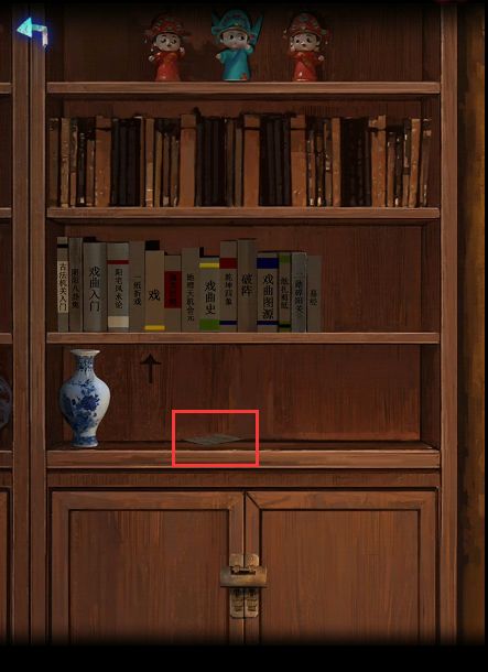 3、书柜上有一排刻了颜色的书,根据箭头指示的第一本,以下一本需要有与前一本同色的书籍的顺序点击,获得小陶人和铜钥匙(钥匙很扁,注意不要漏掉了),右边的桌子获得纸钱,将纸钱递给门口蓝色纸人,获得戏票。