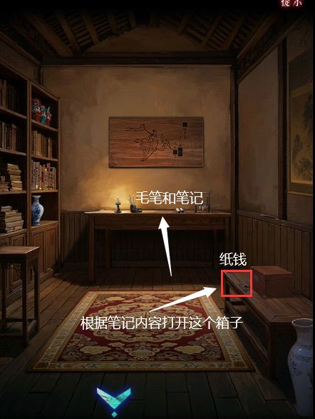 2、将纸元宝递给戏台帷幕后的手,打开帷幕,左边柜子上获得图案纸张,中间桌子获得毛笔,还有一本笔记本,每页下方都有➹图案和字的,汇集起来一共是“匡丑凶风同匹”其中每个字对应不用的和数字,观察文字发现开口放下与箭头朝向一致,也就是右左上下下右的顺序,根据这个顺序点击右边的箱子,获得字块“生”和“长”。
