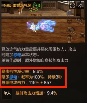 一些单段式技能只能施加1层感电,像气玉弹就可以施加10次感电状态,所以在加点时需要注意一些多段攻击的技能,即使技能倍率不高,只要攻击段数高,点1级也有不错的伤害