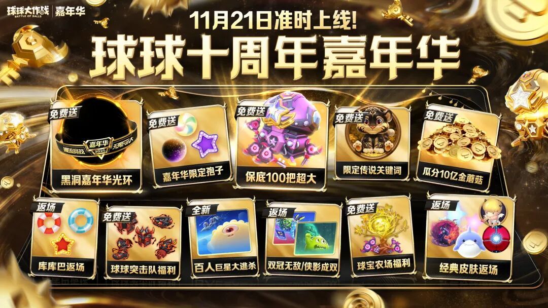 💫十周年⌈黑洞嘉年华⌋绝版光环,11.21登录送!💫无门槛保底100把超大钥匙,免费送!💫打游戏分10亿金蘑菇,全天掉落!💫黑金配色传说关键词,免费得!💫保底1款嘉年华限定孢子,开箱领!💫农场嘉年华种子,得至多50把超大钥匙!!💫突击队魔龙装备自选,免费领!💫甲壳虫等海量经典皮肤,限时返场!💫糖果战争、库库巴,全返场!💫双冠无敌版、侠影成双,全返场!💫百人巨星大逃杀,3倍升星!💫全新剑宗主题装扮,农场上新!💫嘉年华至臻极品升级!超大奇妙宝箱上新!💫⌈甲壳虫·神谕⌋幻化系列!拥有基础款即可幻化!💫⌈希腊神话⌋通行证!丘比特免费送!阿芙娜新升级!💫限定雪山⌈奥林匹斯之巅⌋,嘉年华限定上新!