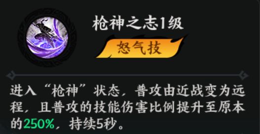 普攻输出武将。释放怒气技改变自身的普攻形态,射程提高的同时伤害亦跟着增长。觉醒技搭配枪神状态有概率额外攻击2个目标,清怪效率小幅提升。