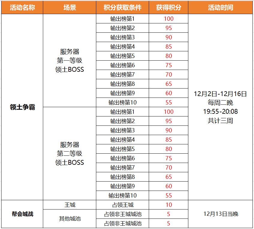 活动内容:作为帮会团战最重要的两个活动玩法——帮会领土争霸和帮会城战是争夺帮会荣耀和奖励最重要的战场。帮会参与这两个活动,都有机会获得活动积分,并将以此角逐出团战最强帮会!