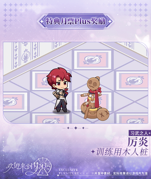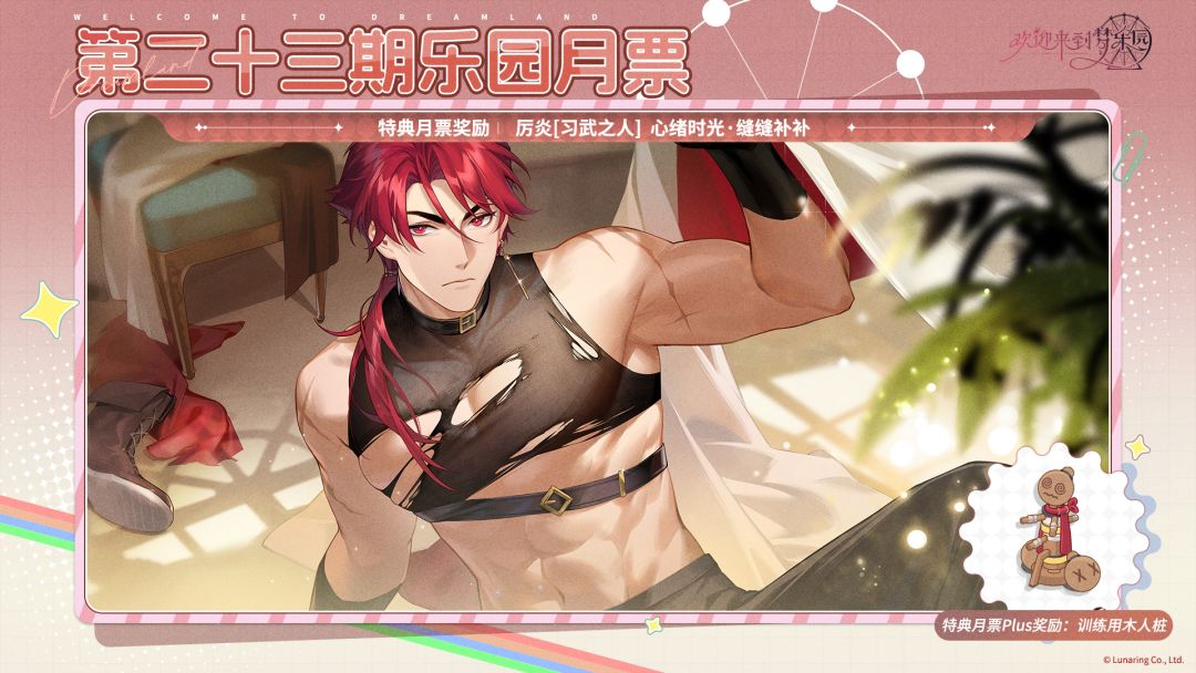 -核心奖励内容:解锁乐园月票进阶奖励、厉炎[习武之人]心绪时光·缝缝补补、厉炎[习武之人]专属互动家具「训练用木人桩」