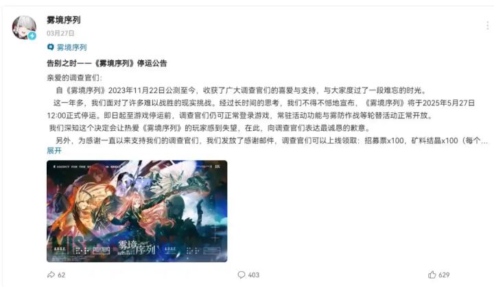 今年3月,《雾境序列》正式发布了游戏的停运公告。