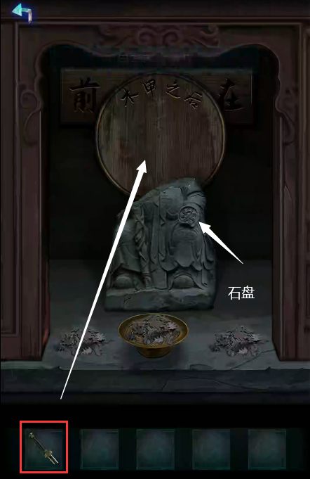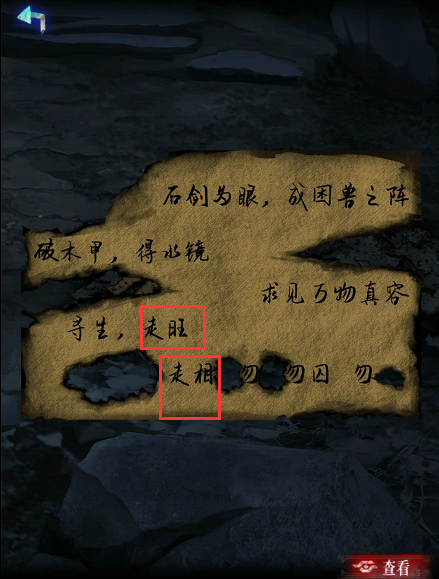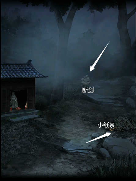 2、断剑在小庙使用,木甲消失,出现水镜,获得小纸条,上面写着辰戌丑未为旺,巳午为相,和之前树叶堆的小纸条可结合起来解读,石像右手获得石盘。