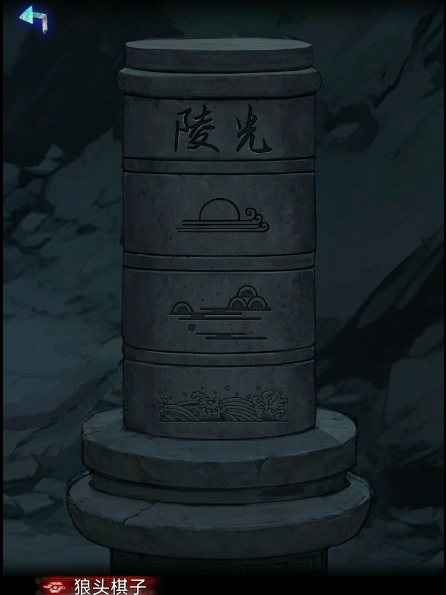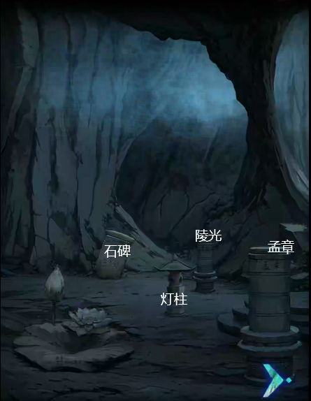 6、进入右边场景,同样有一根灯柱有画和数字,同时还有两根图腾柱,分别写着“孟章”和“陵光”,