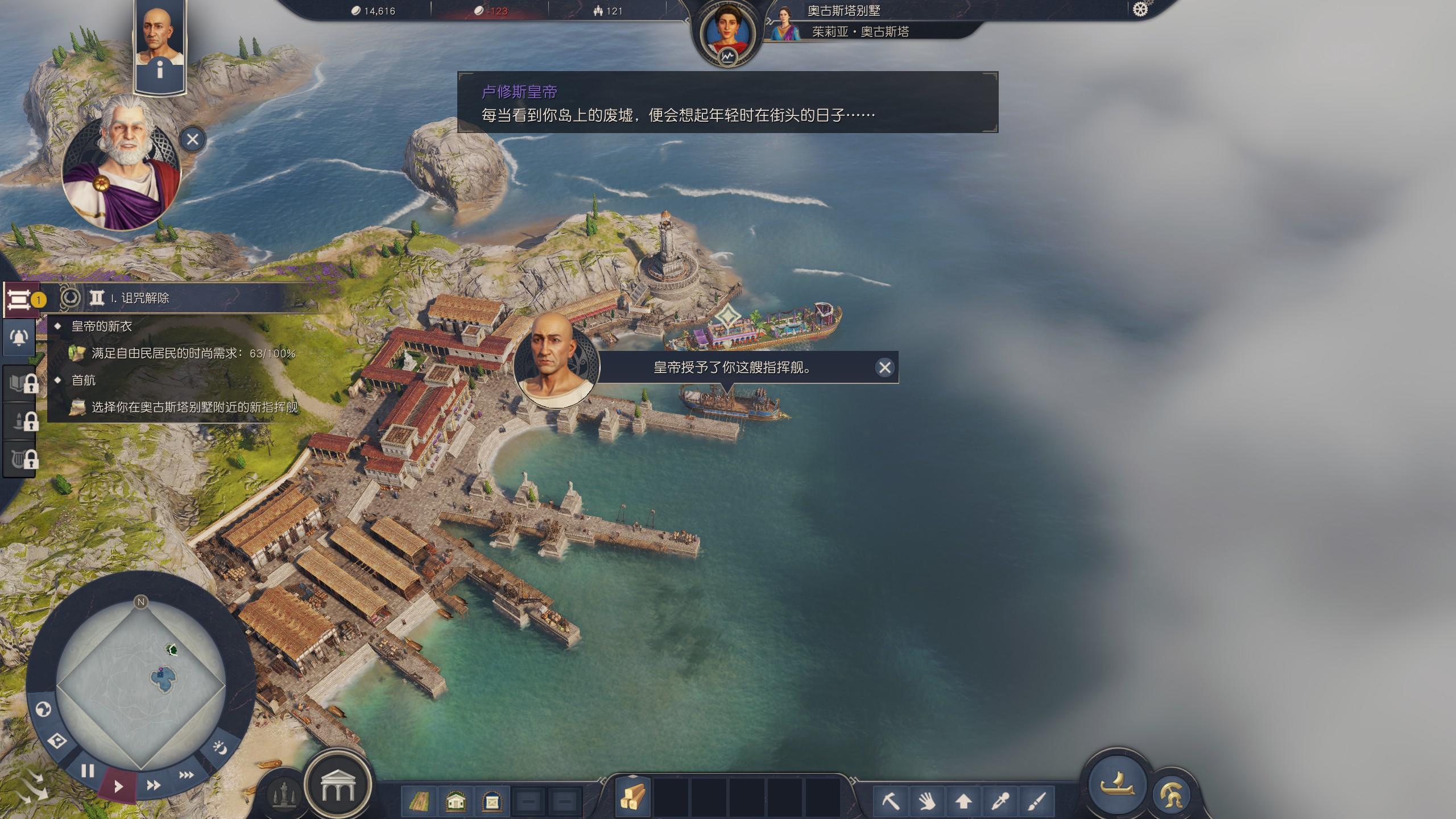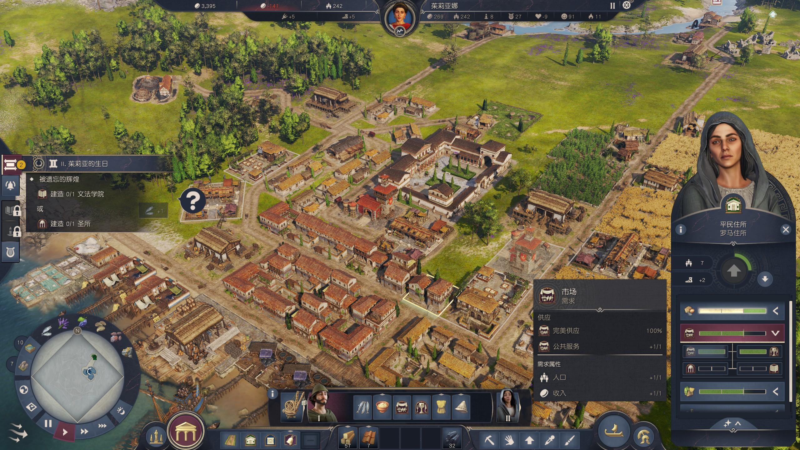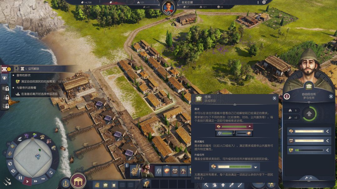 登岛之后玩家用的女性角色会带着丈夫的资金,在一位管家的指引之下建造岛屿,而且吸引人民来住,然后根据这些人口的劳动中获取税收,提高税收就要满足居民的满意度和需求,当这一阶段的人民需要被满足后(每个分栏完成一边即可,不需要全部满足),就可以进行升级,解锁新的产业链和建筑。拉丁姆地区仅有四个等级,分别是自由民、平民、骑士与贵族,另一个沼泽地区人口等级则有五个之多,并且是单独的。