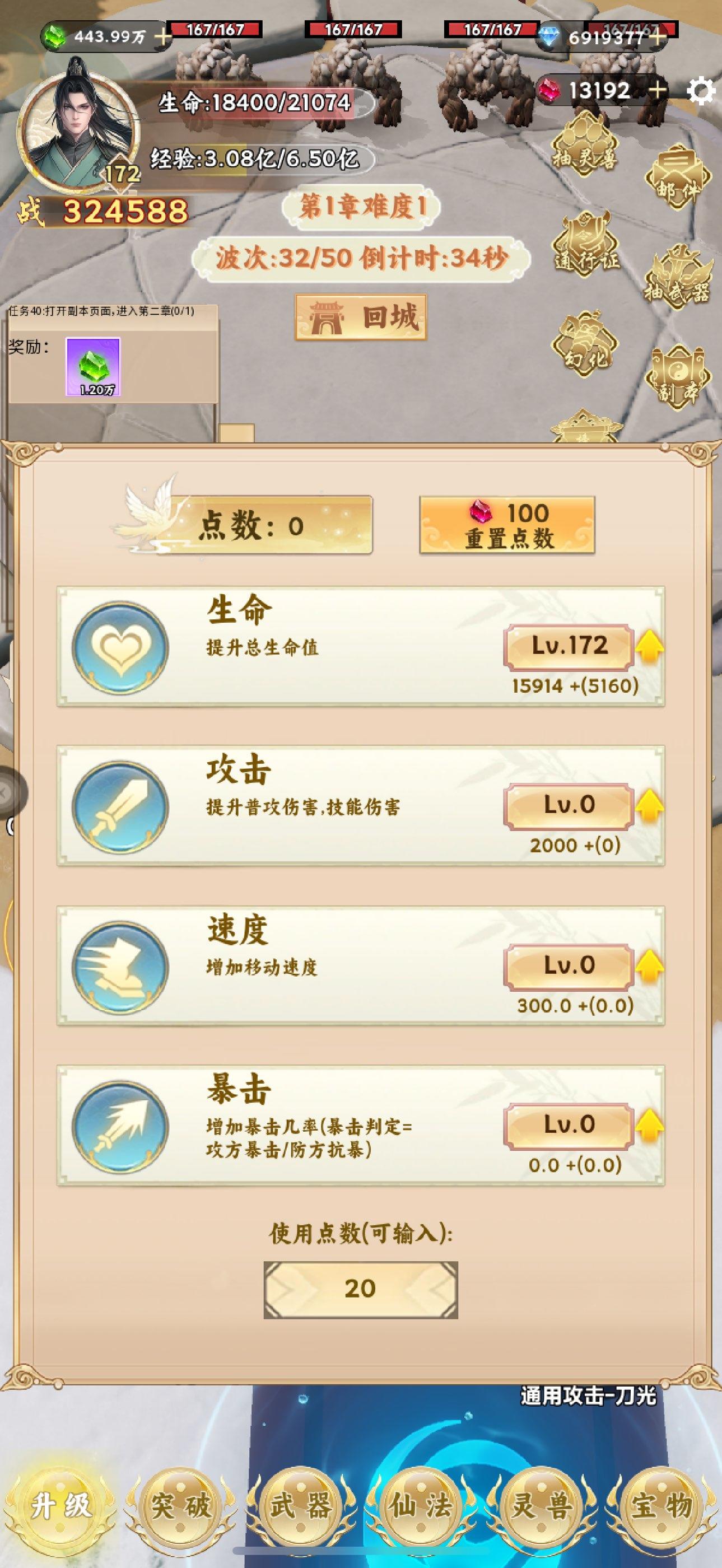 关于加点策略,前期让攻击力刚好等于当前最大关卡怪物的血量就行,其他的都加生命值,后期点数较多可以把暴击点到100,移动速度属性最后点(部分秘境关卡需要用到移速)