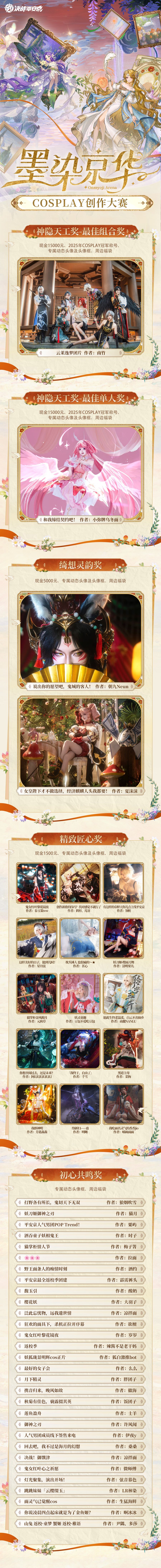 本次活动设有【百绘罗衣创作大赛、同人插画创作大赛、同人表情包创作大赛、COSPLAY创作大赛、视频创作大赛】五大赛道, 综合考虑玩家投票、设计深度、视觉效果、作品完成度、与游戏内文化契合度等多重维度对作品进行评审后,现已评选出五大赛道的多个优秀作品奖项,恭喜各位获奖者!