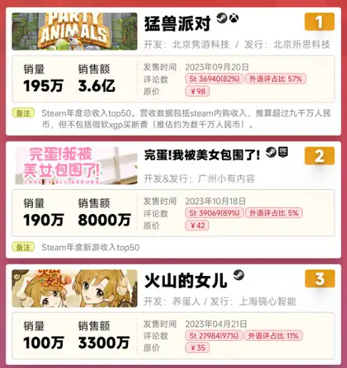 游戏自2023年4月21日发售以来,迄今为止已经在Steam获得数万条总计98%的超高好评率,甚至一度登上2023年国产买断制游戏销量半年榜第一名,并在全年榜上排名第三。
