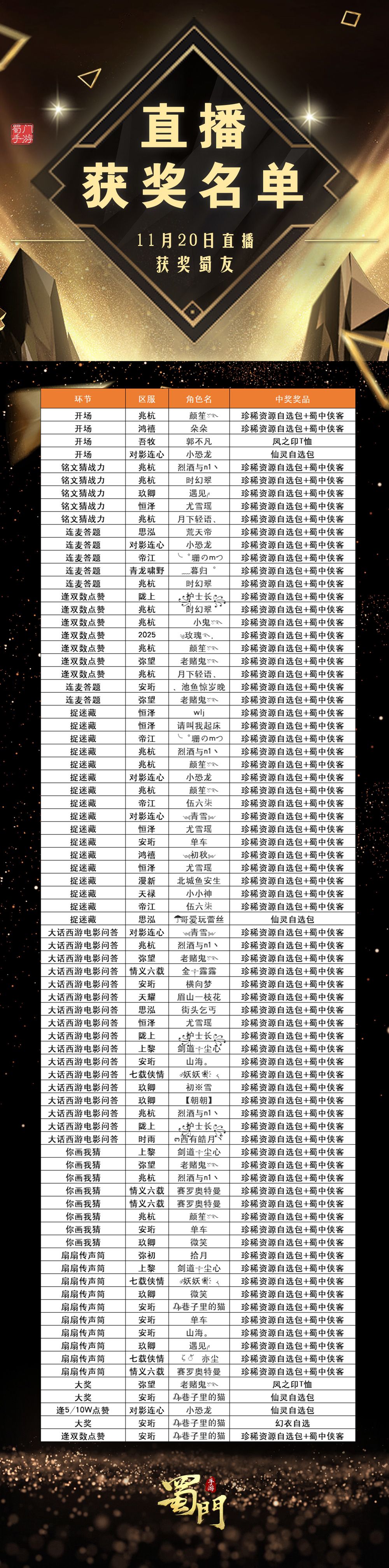 本次直播也送出满满的福利!这次是以下幸运蜀友获得的奖励,恭喜各位~这些奖励都是在直播间实时送出,下次直播我们还在直播间等你~