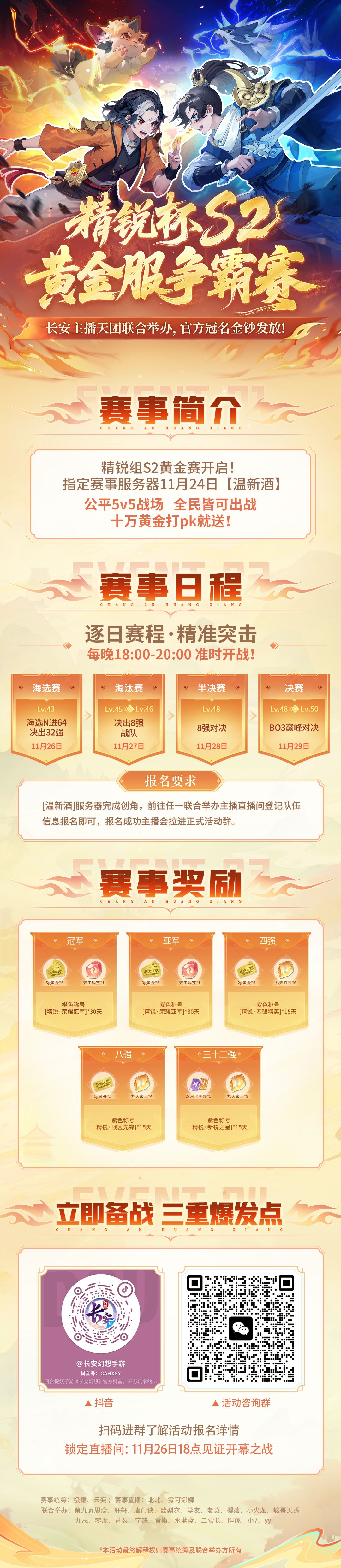 各位《长安幻想》的御灵师们注意啦!由长安主播天团联合举办的精锐杯 S2 黄金争霸赛热血开启,公平 5v5 战场全民可战,十万黄金打 PK 就送!(文末有互动抽奖)