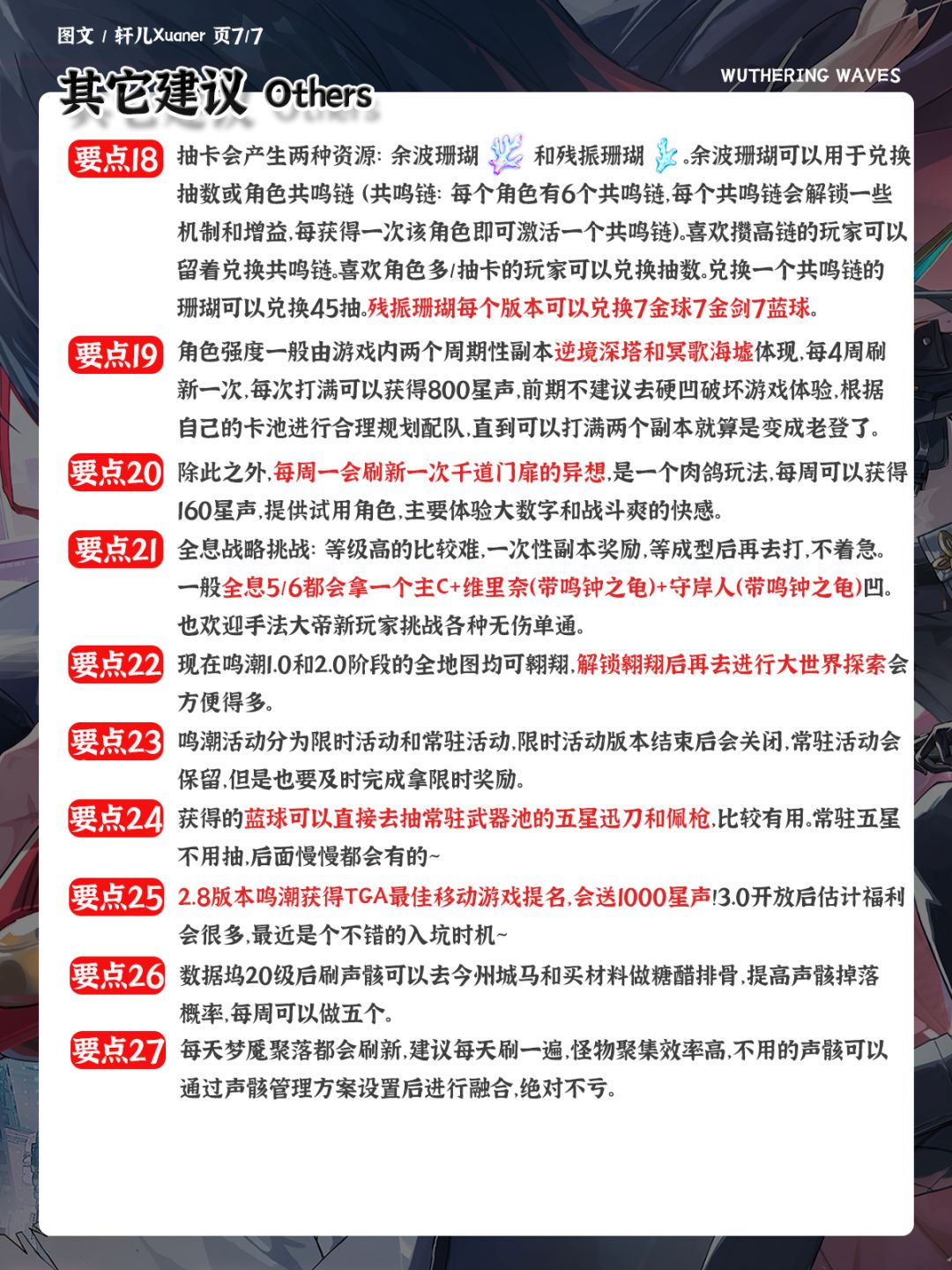 ③ 蓝色知识部分是一些鸣潮基础知识的讲解,如果你已经足够了解了,可以跳过。红底部分是一些建议,可按需采纳~