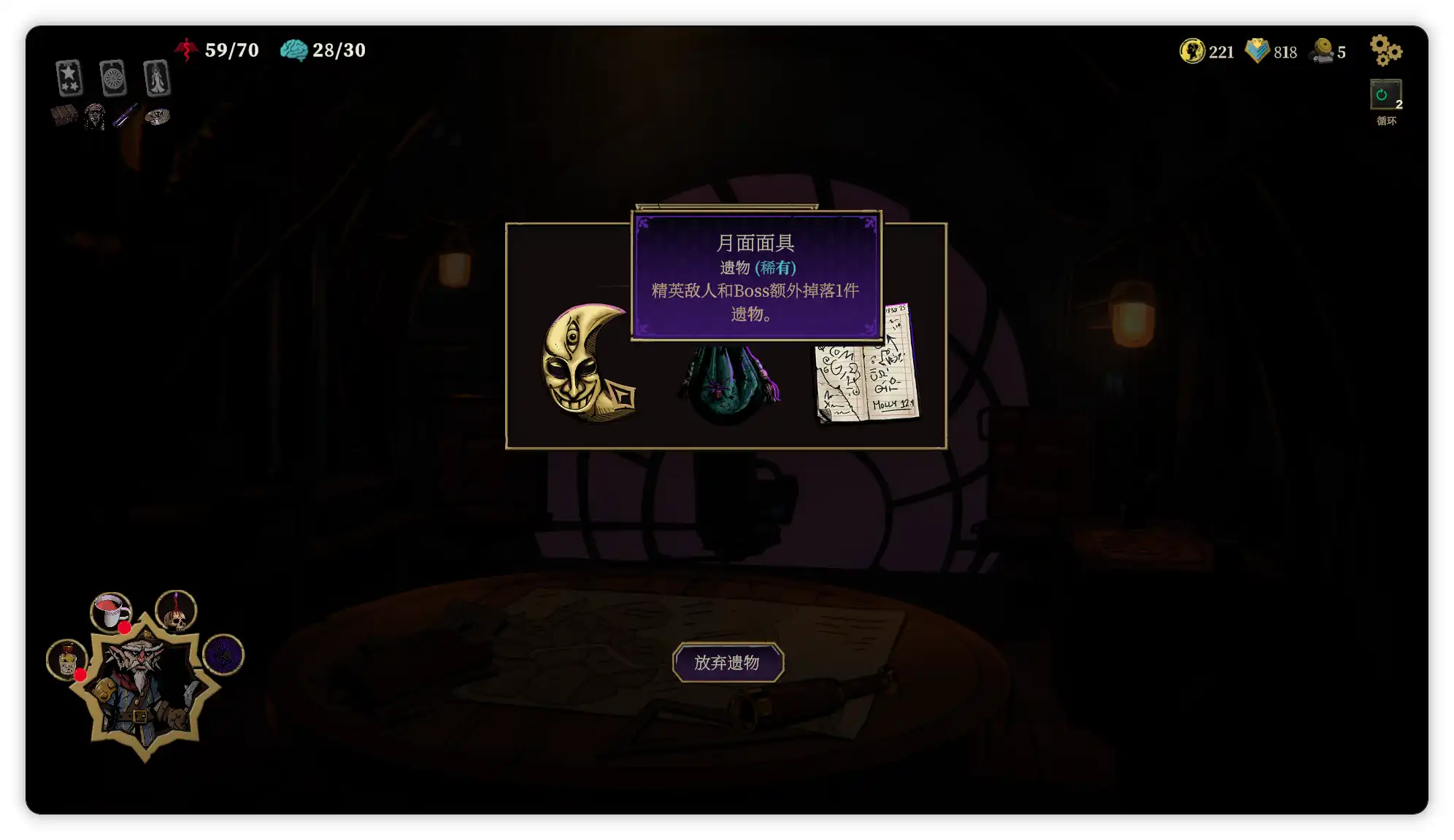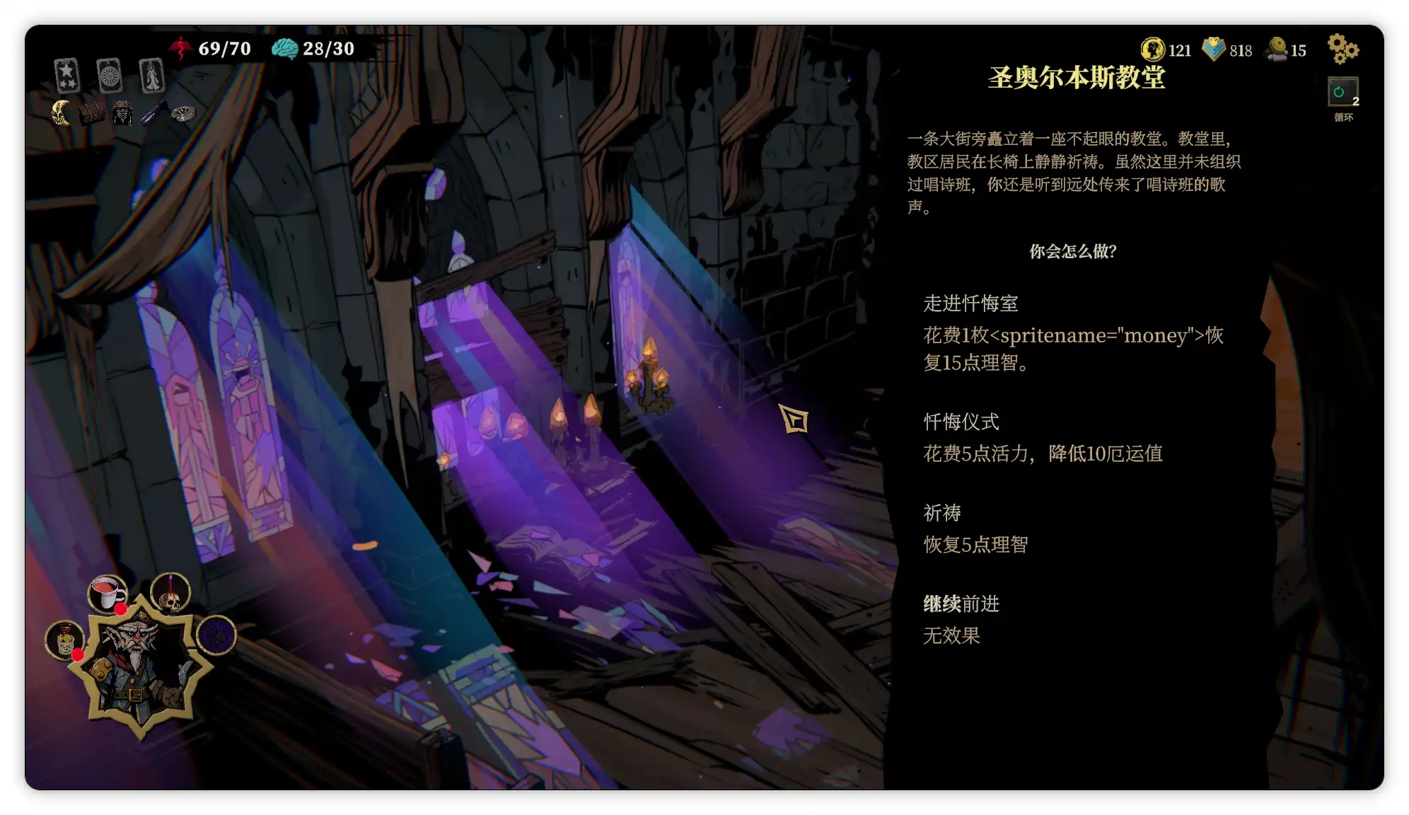 每次选择一个事件后都会获得1点厄运值(直接获取遗物的事件选择是2点),厄运值会提高血月等级,血月等级越高怪物的实力加成也越高,所以在任务循环中难度会逐级递增,而圣奥尔本斯教堂事件可以降低厄运值和恢复理智。