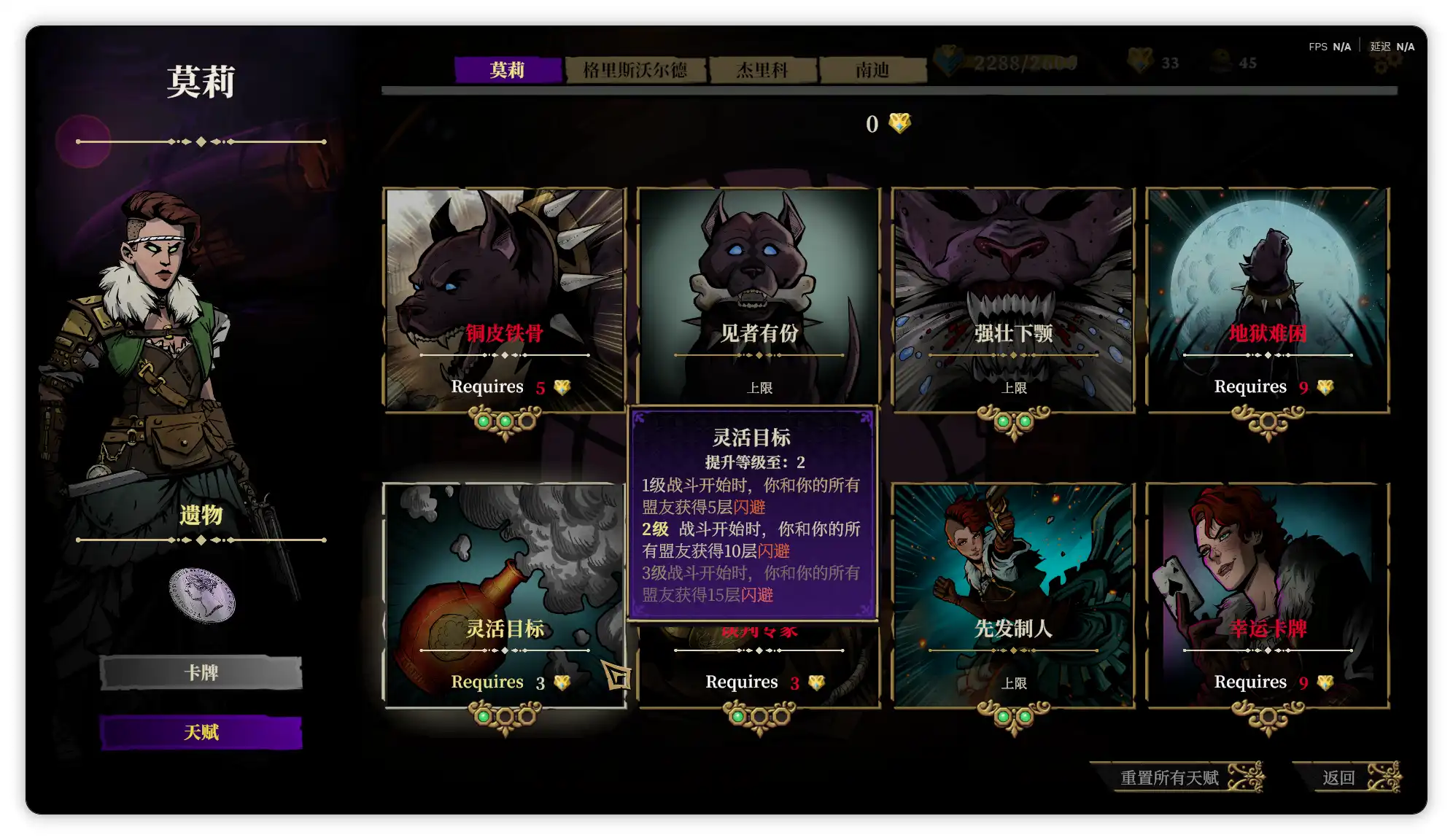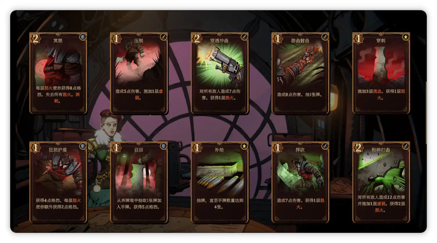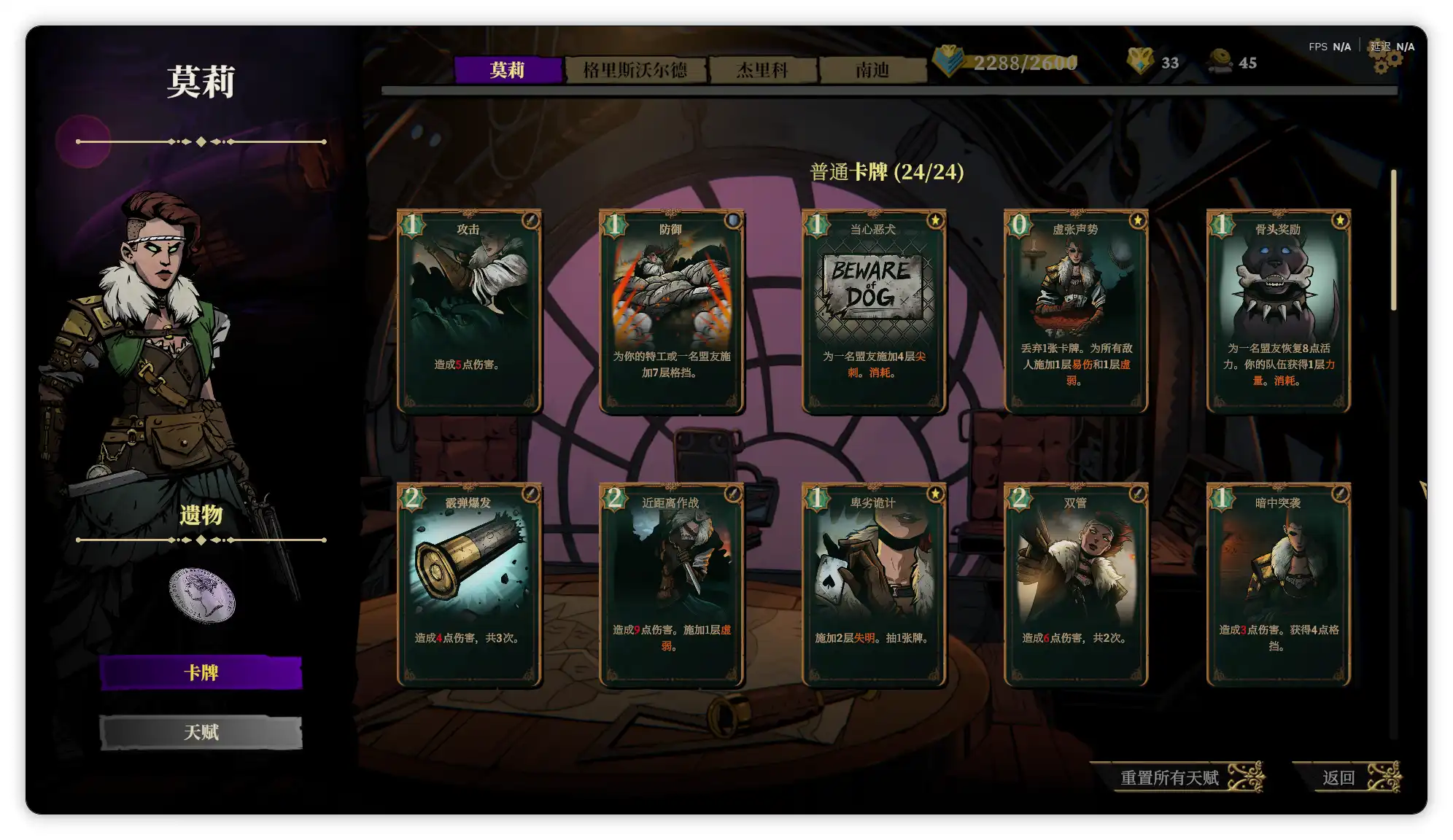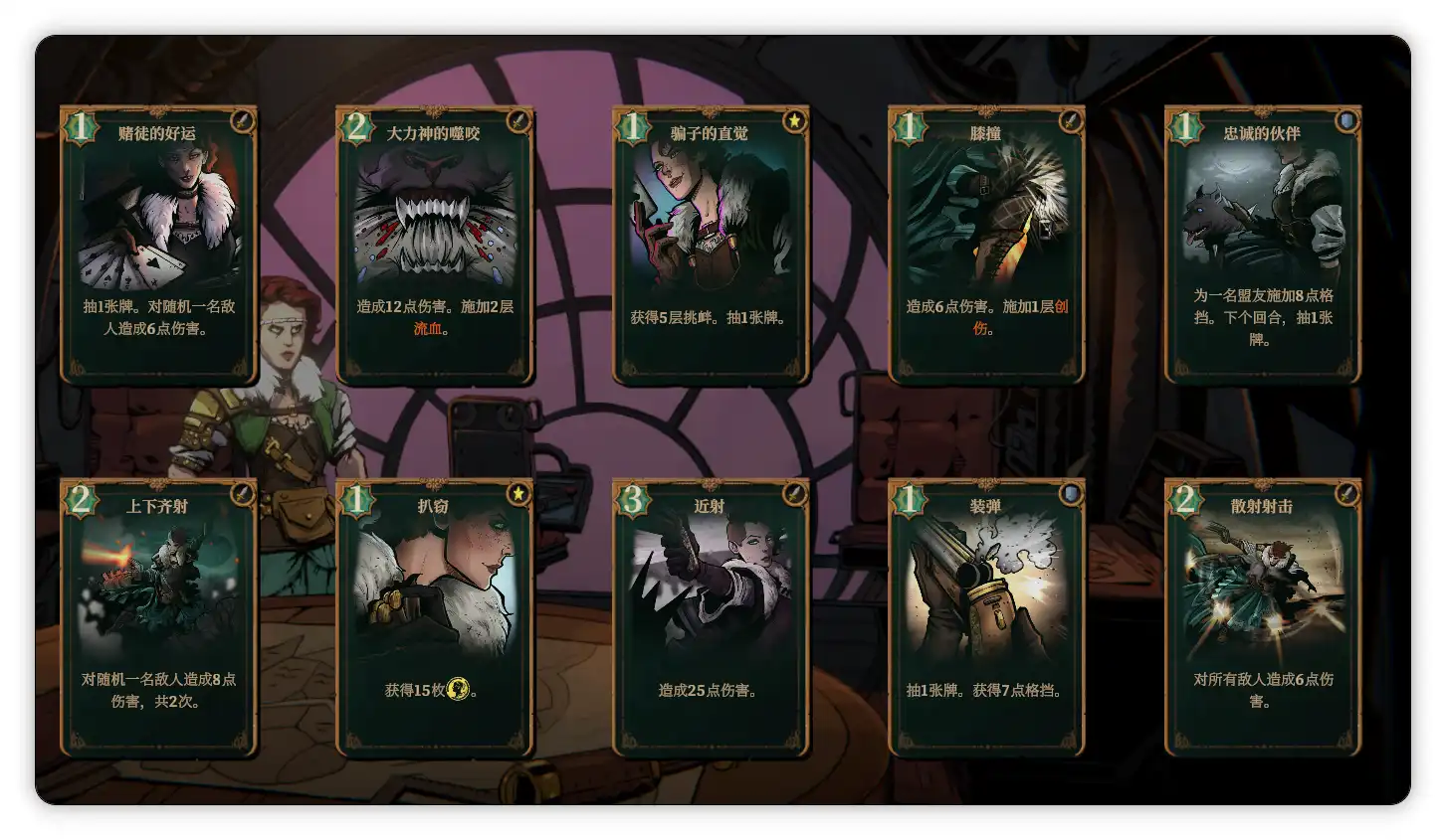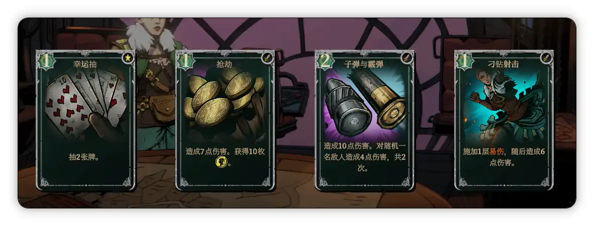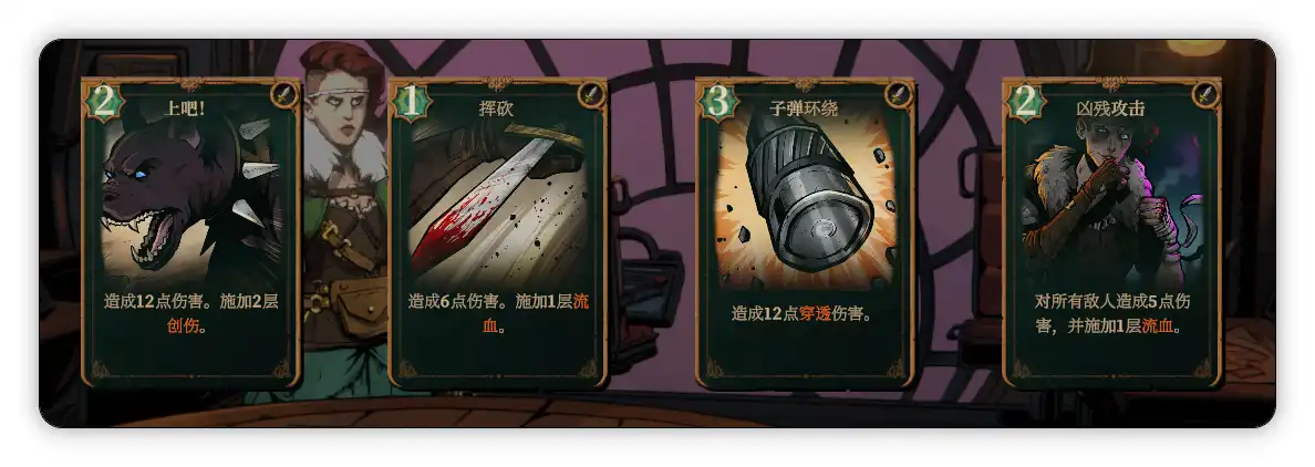 首先是莫莉,这个角色会固定带着一只叫赫拉克勒斯的大黑狗盟友,活力值归0后会在几回合后复活,作为最开始解锁的角色,强度中规中矩,通常靠多重攻击和给敌人套易伤和虚弱的debuff作战,初始遗物是银币(商人商品价格降低25%),专属技能是可以抽取一张卡牌