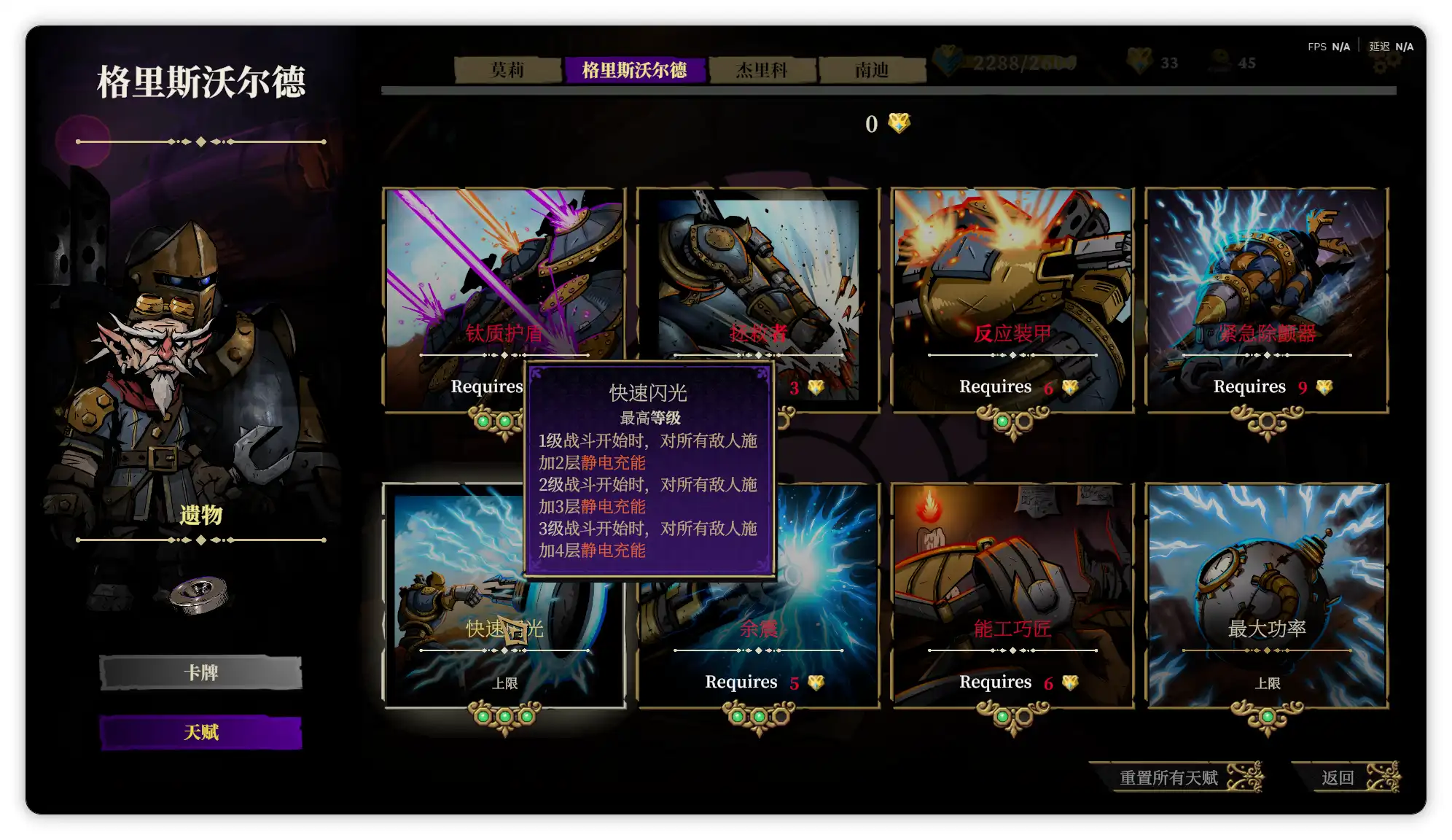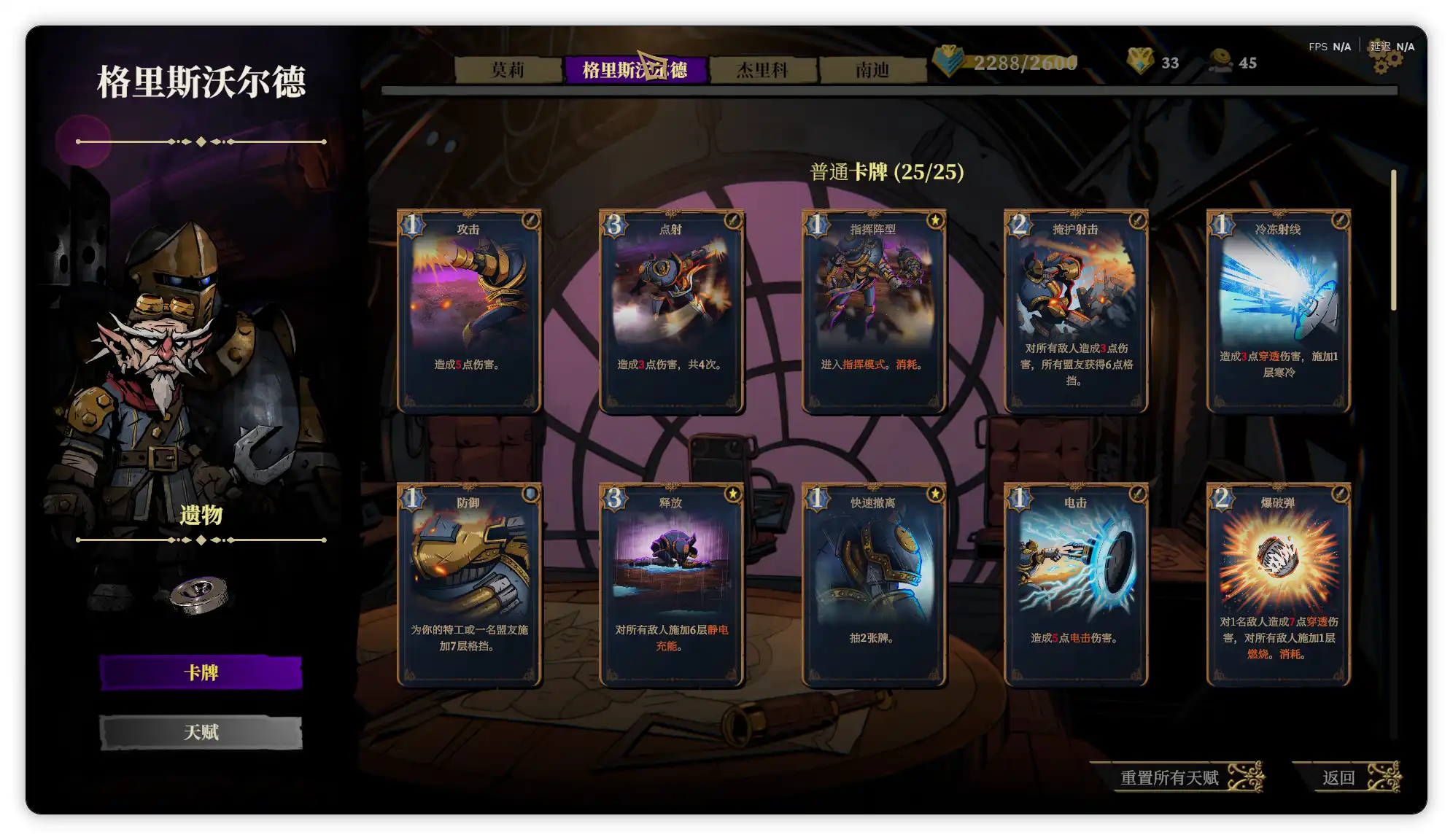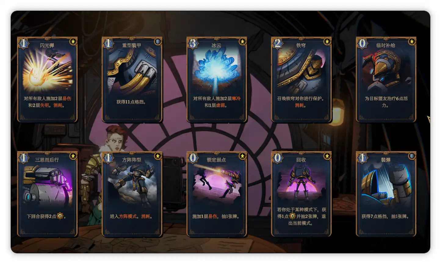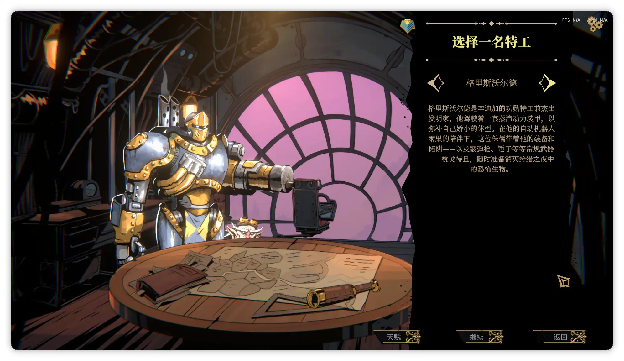 格里斯沃尔德的本体是个矮小的老头,并不是那个看起来像从战锤40k世界出来的克系蒸汽机甲。这个角色的定位有点像召唤师,卡牌构筑倾向火力压制,依靠静电充能伤害和穿透攻击;并且玩家操控的角色(游戏里称之为特工)有一个叫雨果的蒸汽动力飞行物盟友,所以初始遗物是零磁力磁铁(每个任务开始时,雨果以满活力状态复活。)拥有独特的三形态,分别是普通模式、指挥模式和方阵模式;由于卡牌构筑中可以召唤众多机械盟友,其火力覆盖非常适合应对多单位的敌人。
