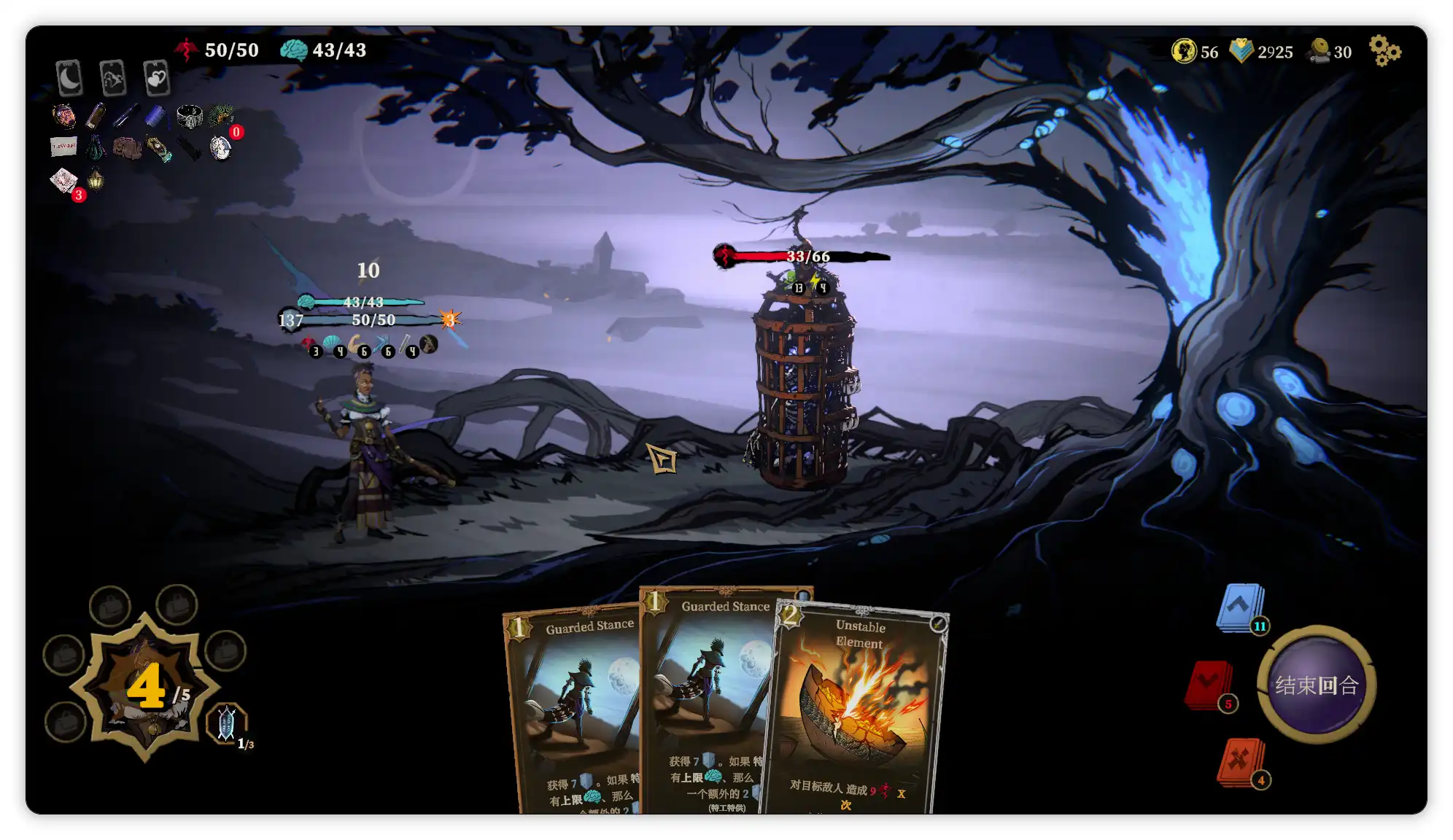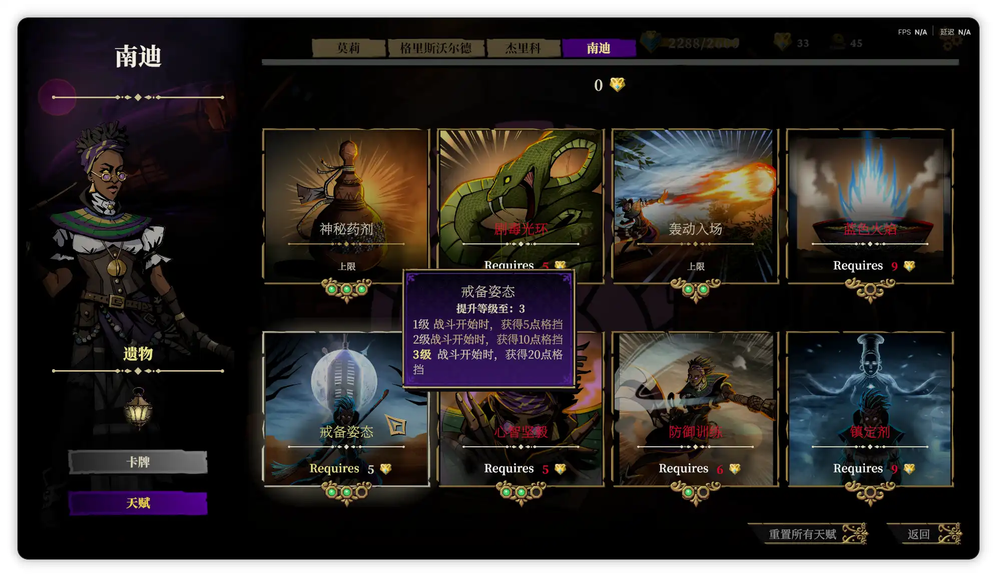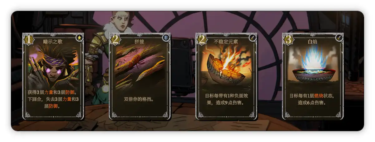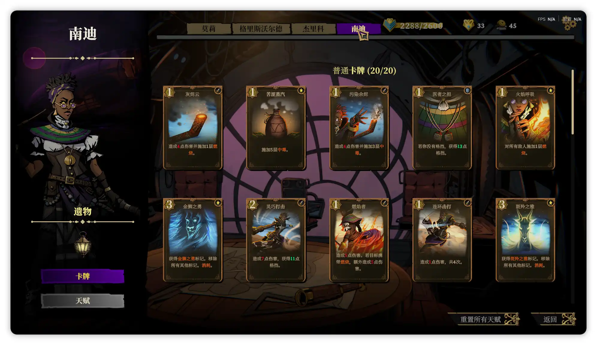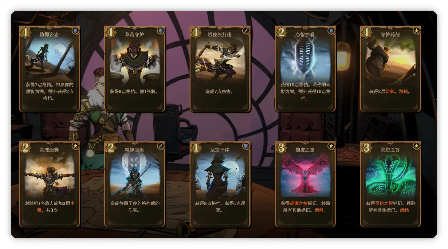南迪的专属技能是增加护甲,初始遗物是淡玻璃灯笼(旅行卡牌预览数增加1张。旅行牌组数增加1组);很难想象看起来非常瘦弱的南迪是四个角色里最肉的,因为她的卡牌构筑与格挡值息息相关,,游戏中的护甲每回合衰减50%,而南迪的3费卡牌斑羚之雅可以保留上回合保留的护甲,搭配2费的精神坚毅(造成等同于你的格挡值的伤害),可以说既肉又有输出;其卡牌构筑多为给敌人添加中毒、燃烧的debuff,是我四个角色中全通关感觉最轻松的,经常无伤过。