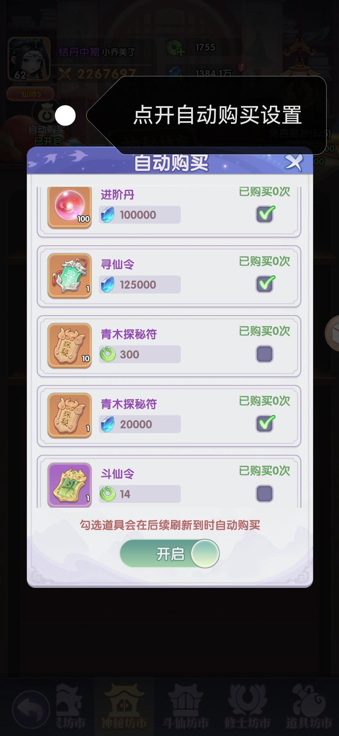 (1)仙玉是硬通货,不要浪费在不必要的地方。每天神秘坊市,可以刷新100次,共2000仙玉,可以获得资源。如图勾选设置