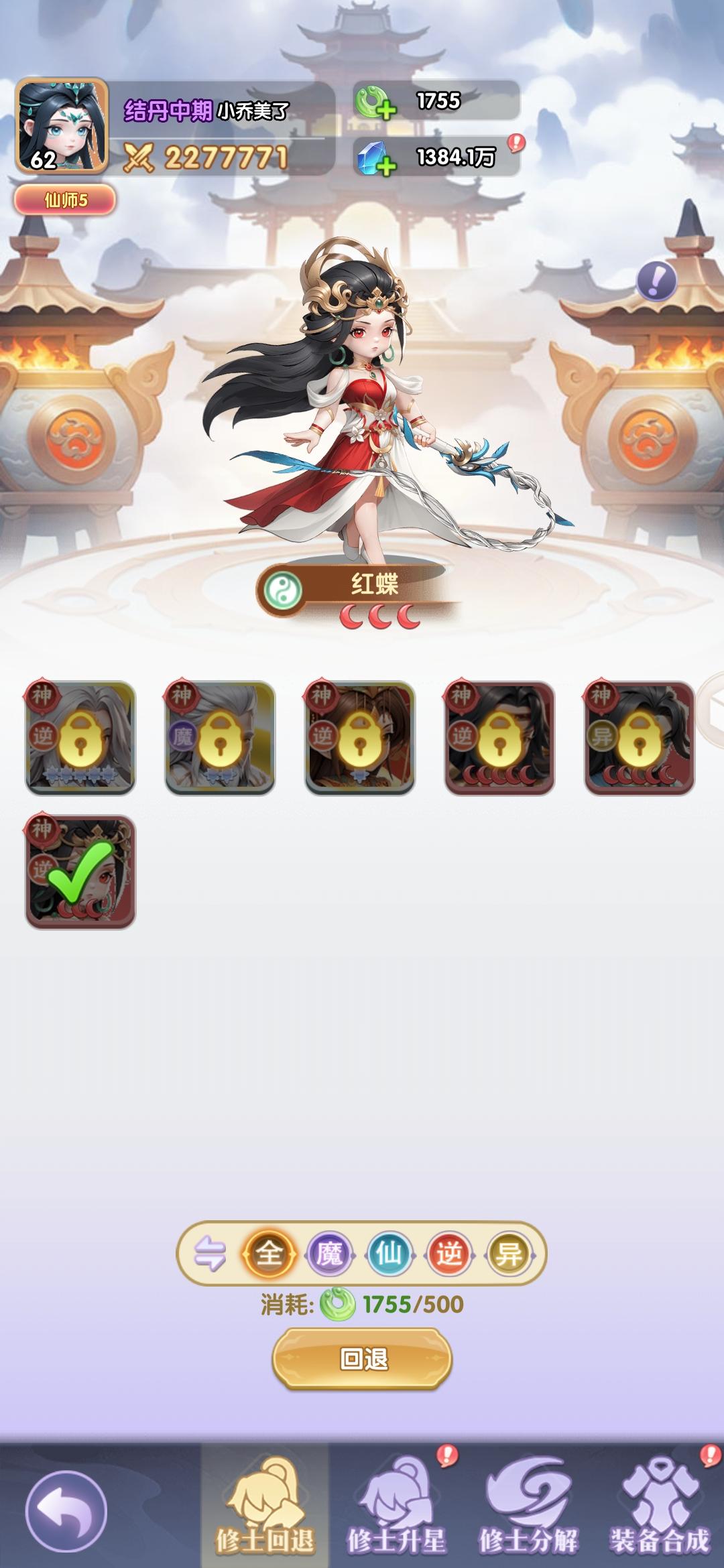3.修士分解(后面要更换阵容,可以把前期不需要的修士分解了,分解保留该修士的本体,其他吃的修士卡会作为修士灵魄狗粮返还,分解需要500仙玉)
