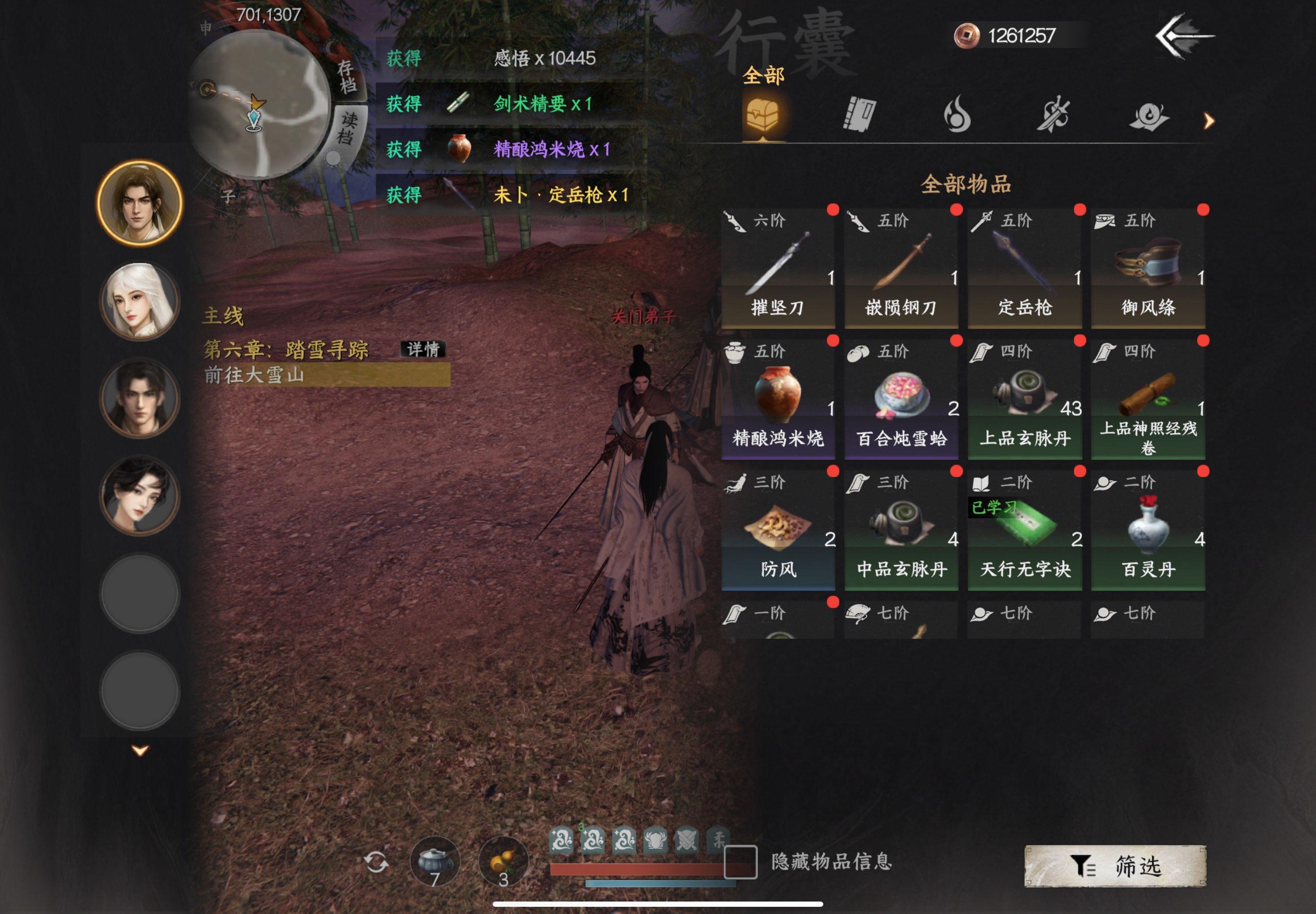9.(1629,1059)几只野怪掉落镇山锁岳枪,该武学心法万籁山河,可以用于经脉洗练刚属性,升到三级再去经脉洗练