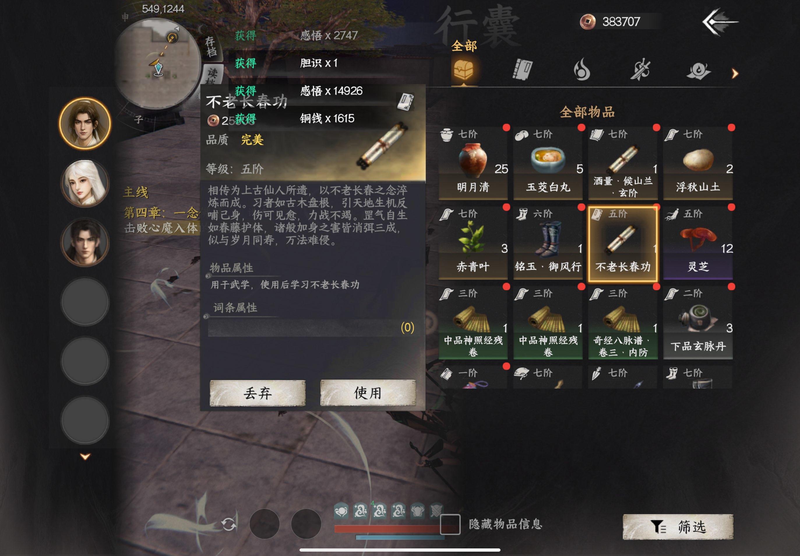 12.(549,1244)获取不老长春功,双万法森罗加不老长春功很能抗。陵上柏→风行剑→天下第一剑→牛金牛,使用这套基本能稳定打过第四章的bug boss,并轻松打完第五章获取天下霸剑,之后将风行剑替换为九转乾坤,心法替换为纵横八荒