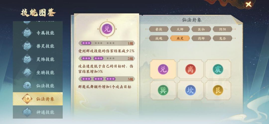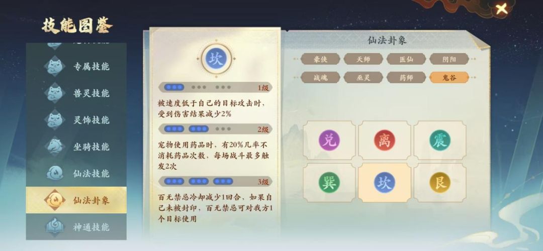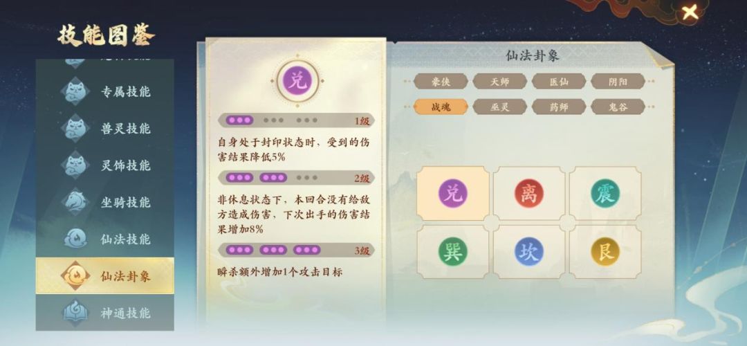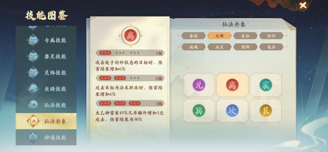 仙法合成分卦象和属性2种,卦象可以通过提炼来替换卦象,仙法属性可以通过合成来随机重置属性,由于属性的获得比较随机,所有职业都要先满足卦象达到要求之后再去考虑提升属性。