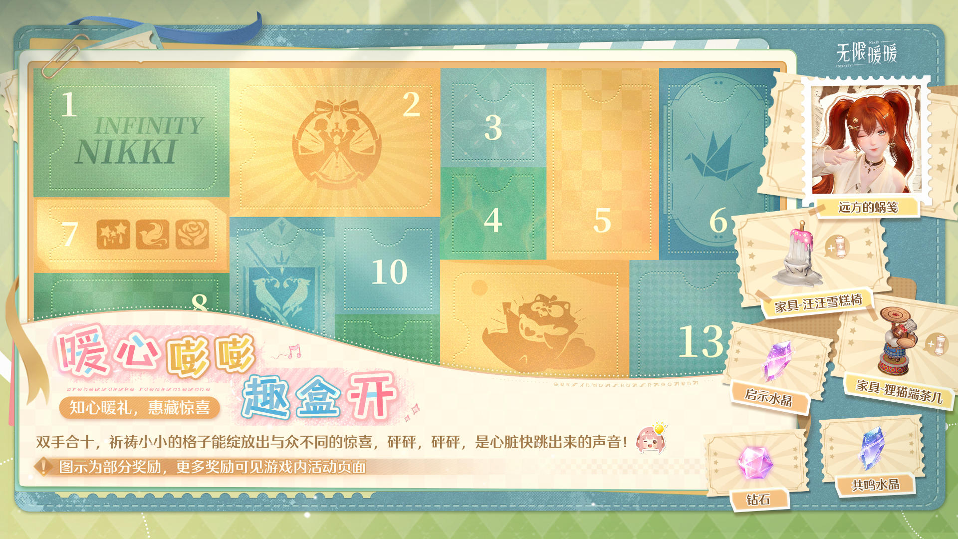 🎉砰砰心动盒奖励包括:三星套装【远方的蜗笺】、【狸猫端茶几】家具设计图*1(附送成品家具*1)、【汪汪雪糕椅】家具设计图*1(附送成品家具*1)、总计钻石*220、启示水晶*1、共鸣水晶*1、璨光棱镜*10、闪亮泡泡、噗灵等多重好礼。