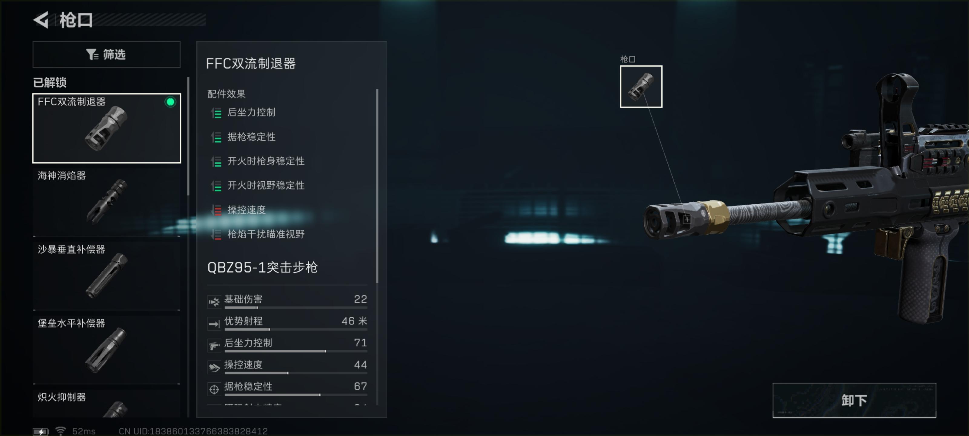 枪口选择FFC双流制退器。这个枪口作为上赛季的新枪口,在操控速度上面虽然略有明显的减少,但是对于操控速度55的枪械来说可以忽略不计,同时还能增加枪械的稳定性。