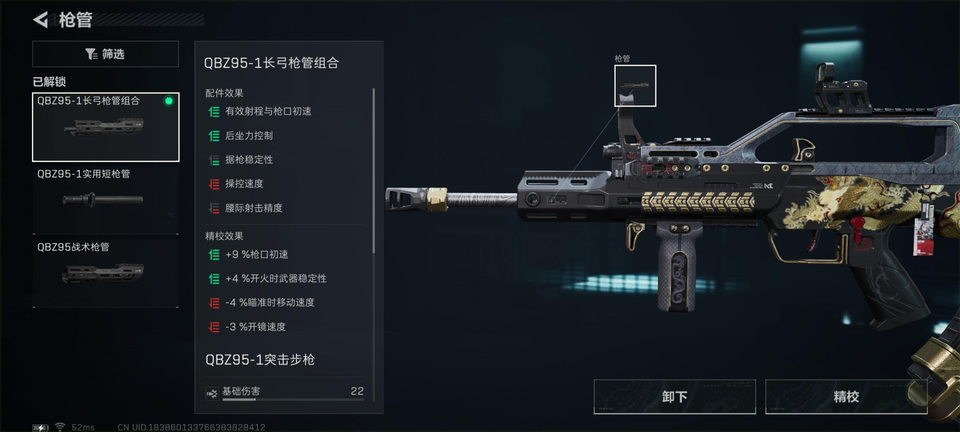 枪管选择QBZ—1长弓枪管组合。这个枪管可以提升枪械稳定性以及优势射程,在原有40米的射程上提升6米远距离对枪胜率能更胜一筹。
