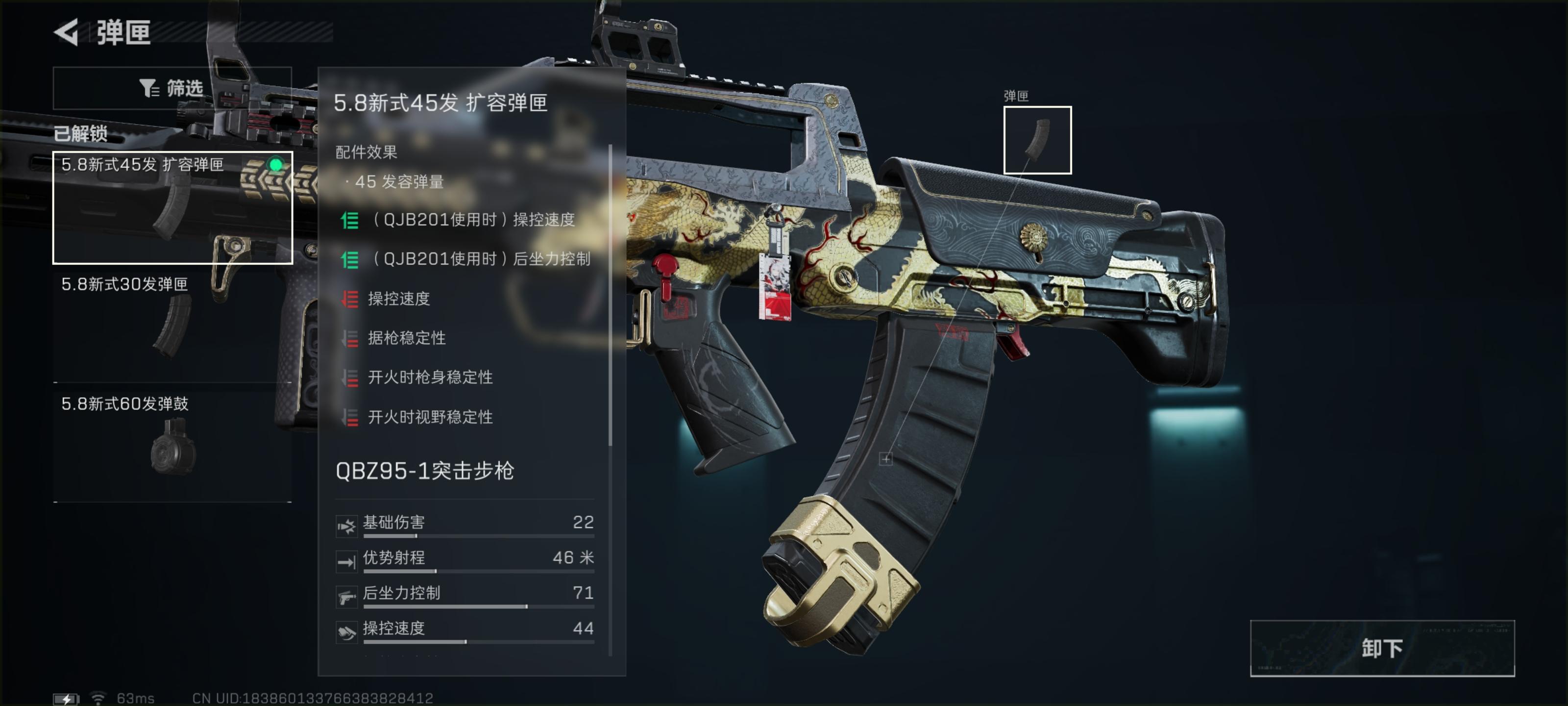 弹夹选择5.8新式45发扩容弹匣。在原有的30发上提升了18发,增加在对枪过程中的容错率以及提升枪械的续航能力。