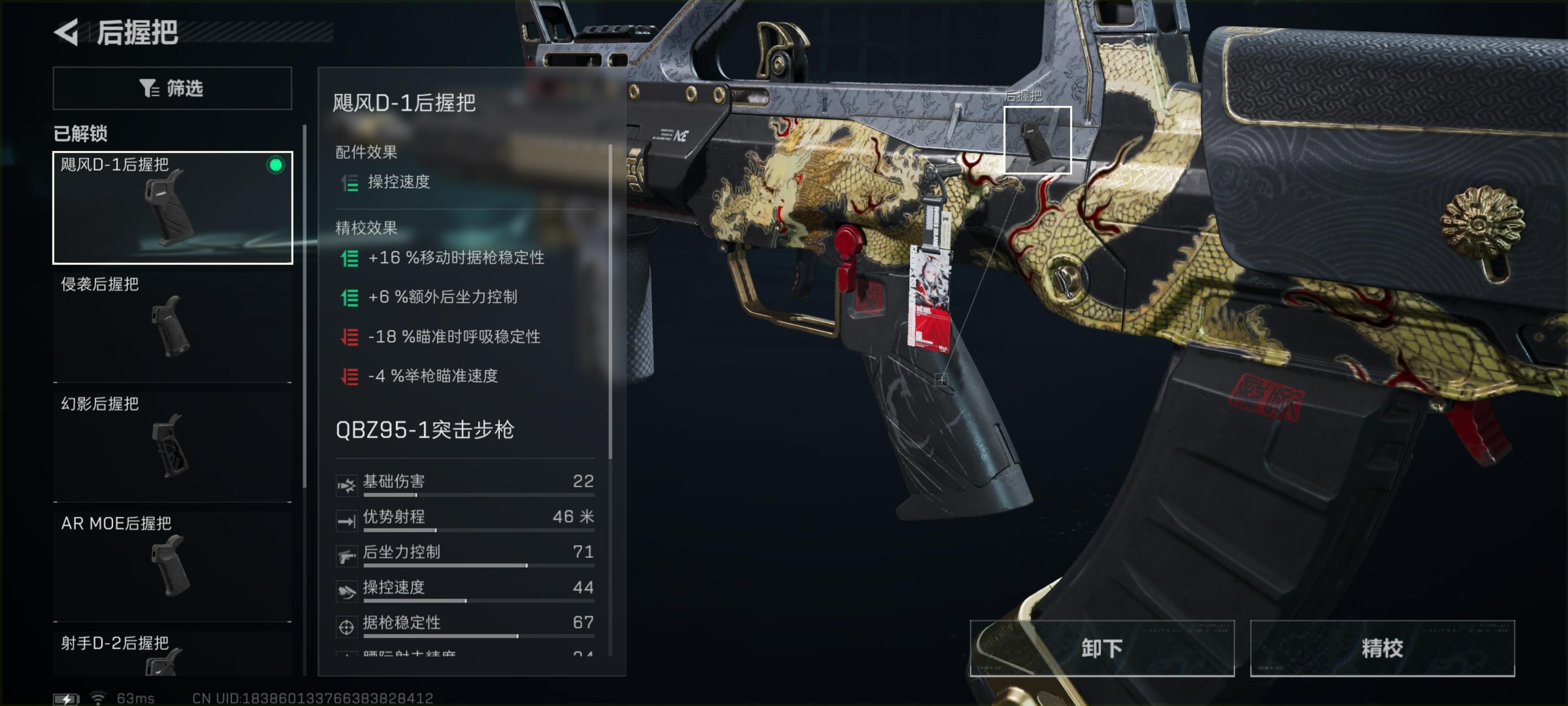后握把选择飓风D—1后握把。这个握把搭配战术垂直握把,可以抵消其余配件带来的大额负面属性操控速度。