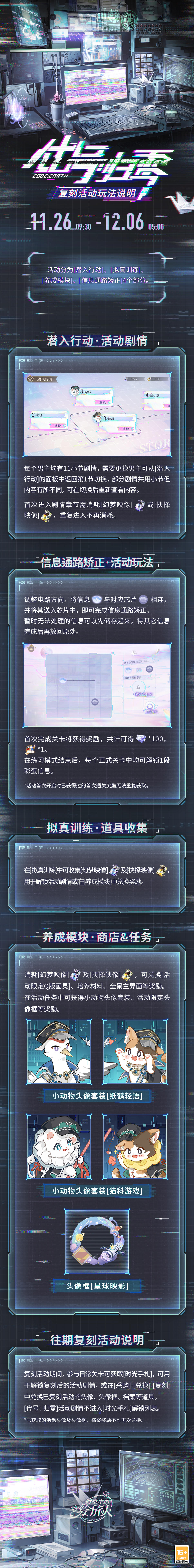 复刻活动分为[潜入行动]、[拟真训练]、[养成模块]、[信息通路矫正]4个部分。