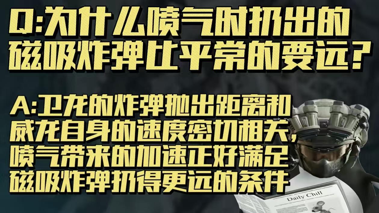 其实决定磁吸炸弹距离远近的最关键因素就是我们威龙自身的速度,大家可以理解为惯性帮助磁吸炸弹飞得更远,所以我们用技能获得加速后扔出的磁吸炸弹是比正常情况扔出的磁吸炸弹距离要远一截的。