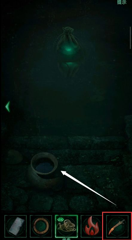 14、使用绳子和左边人俑的枪组合成鱼竿,使用鱼竿勾下右边的布袋,获得水型波纹。