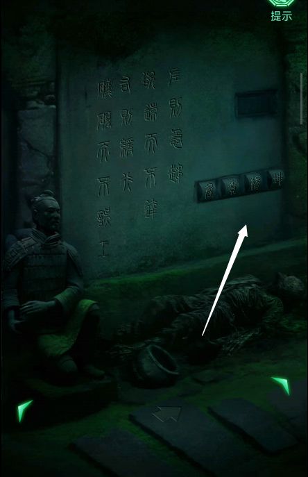 4、点击进入左边的密道,将月亮形状放在墙上空缺图形处激活石头机关,根据《天机鉴隐录》记载将所有石头按照由小到大的顺序挪至右边,石门打开,获得匕首。