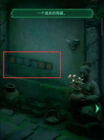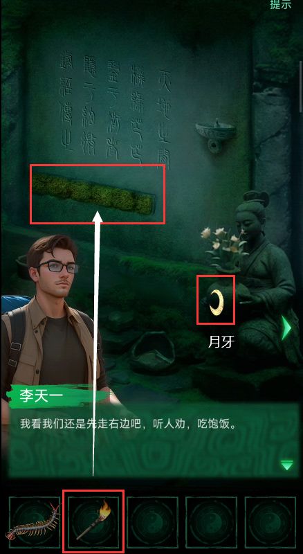 1、右边石碑处获得红龙蜈蚣和长明火把,左边石碑处获得月牙图形,使用火把烧下面的草,看见“阴阳五行天命”六字。