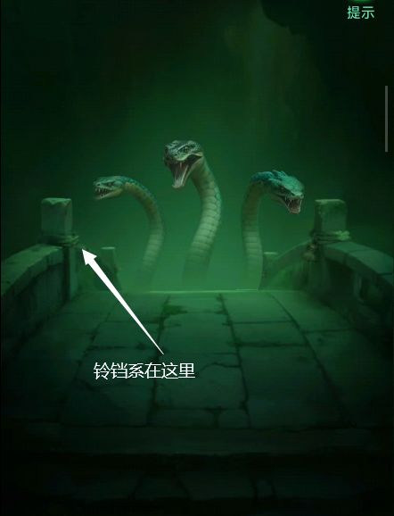 9、把铃铛绑在左边的空缺处,根据书本记载分别点击2、5、3次铃铛击退蛇,地面出现箱子。
